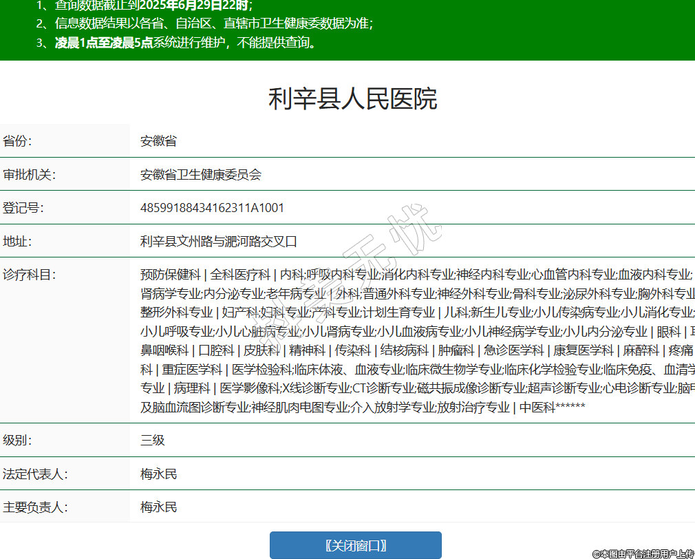 省份:安徽省审批机关:安徽省卫生健康委员会登记号:48599188434162311A1001地址:利辛县文州路与淝河路交叉口诊疗科目:预防保健科 | 全科医疗科 | 内科;呼吸内科专业;消化内科专业;神经内科专业;心血管内科专业;血液内科专业;肾病学专业;内分泌专业;老年病专业 | 外科;普通外科专业;神经外科专业;骨科专业;泌尿外科专业;胸外科专业;整形外科专业 | 妇产科;妇科专业;产科专业;计划生育专业 | 儿科;新生儿专业;小儿传染病专业;小儿消化专业;小儿呼吸专业;小儿心脏病专业;小儿肾病专业;小儿血液病专业;小儿神经病学专业;小儿内分泌专业 | 眼科 | 耳鼻咽喉科 | 口腔科 | 皮肤科 | 精神科 | 传染科 | 结核病科 | 肿瘤科 | 急诊医学科 | 康复医学科 | 麻醉科 | 疼痛科 | 重症医学科 | 医学检验科;临床体液、血液专业;临床微生物学专业;临床化学检验专业;临床免疫、血清学专业 | 病理科 | 医学影像科;X线诊断专业;CT诊断专业;磁共振成像诊断专业;超声诊断专业;心电诊断专业;脑电及脑血流图诊断专业;神经肌肉电图专业;介入放射学专业;放射治疗专业 | 中医科******级别:三级法定代表人:梅永民主要负责人:梅永民执业许可证有效期:2019/09/29 -至- 2034/09/29 -