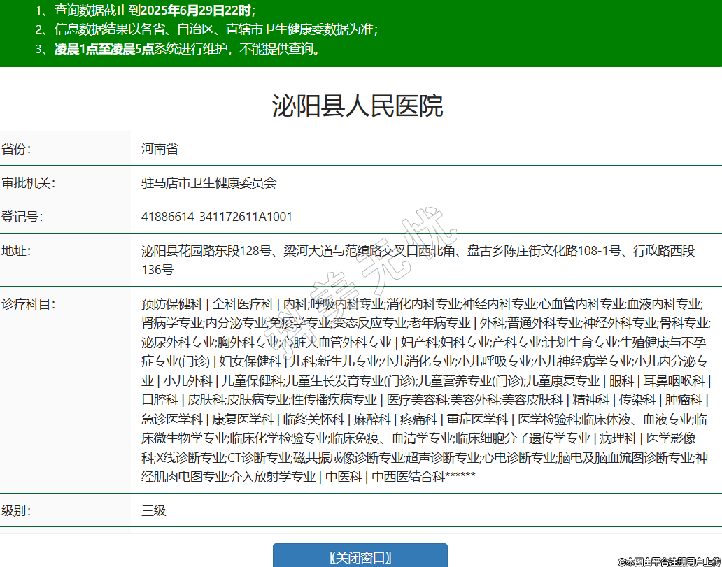 省份:河南省审批机关:驻马店市卫生健康委员会登记号:41886614-341172611A1001地址:泌阳县花园路东段128号、梁河大道与范缜路交叉口西北角、盘古乡陈庄街文化路108-1号、行政路西段136号诊疗科目:预防保健科 | 全科医疗科 | 内科;呼吸内科专业;消化内科专业;神经内科专业;心血管内科专业;血液内科专业;肾病学专业;内分泌专业;免疫学专业;变态反应专业;老年病专业 | 外科;普通外科专业;神经外科专业;骨科专业;泌尿外科专业;胸外科专业;心脏大血管外科专业 | 妇产科;妇科专业;产科专业;计划生育专业;生殖健康与不孕症专业(门诊) | 妇女保健科 | 儿科;新生儿专业;小儿消化专业;小儿呼吸专业;小儿神经病学专业;小儿内分泌专业 | 小儿外科 | 儿童保健科;儿童生长发育专业(门诊);儿童营养专业(门诊);儿童康复专业 | 眼科 | 耳鼻咽喉科 | 口腔科 | 皮肤科;皮肤病专业;性传播疾病专业 | 医疗美容科;美容外科;美容皮肤科 | 精神科 | 传染科 | 肿瘤科 | 急诊医学科 | 康复医学科 | 临终关怀科 | 麻醉科 | 疼痛科 | 重症医学科 | 医学检验科;临床体液、血液专业;临床微生物学专业;临床化学检验专业;临床免疫、血清学专业;临床细胞分子遗传学专业 | 病理科 | 医学影像科;X线诊断专业;CT诊断专业;磁共振成像诊断专业;超声诊断专业;心电诊断专业;脑电及脑血流图诊断专业;神经肌肉电图专业;介入放射学专业 | 中医科 | 中西医结合科******级别:三级法定代表人:贾浩主要负责人:贾浩执业许可证有效期:2025/03/10 -至- 2036/01/07 -