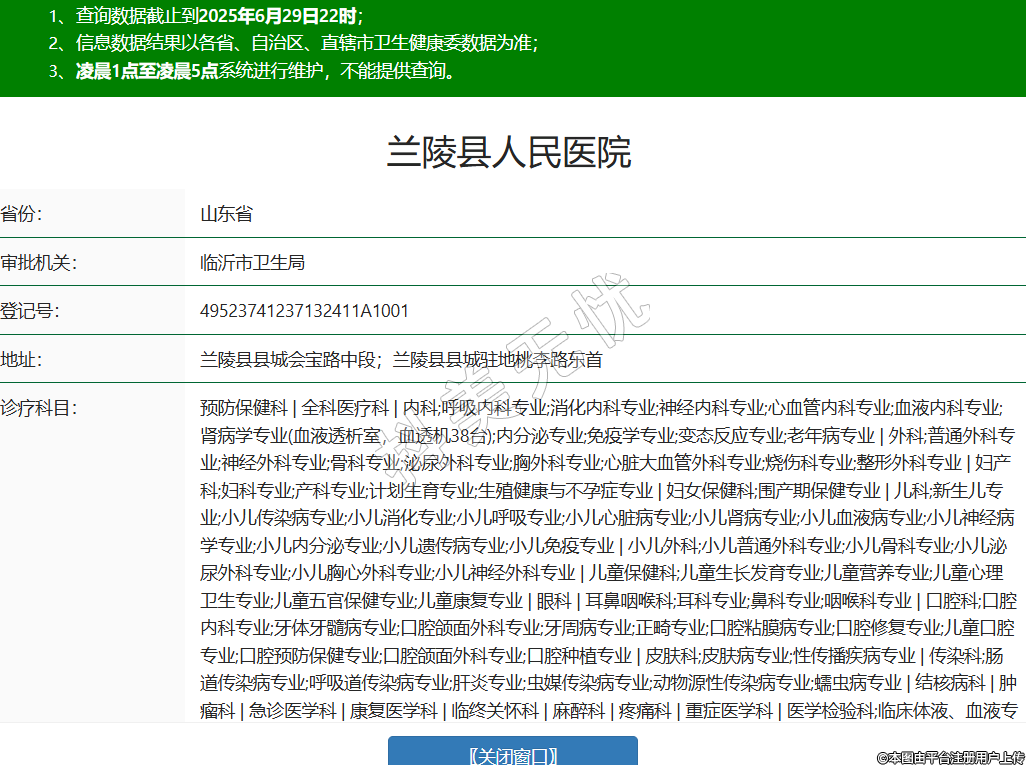 省份:山东省审批机关:临沂市卫生局登记号:49523741237132411A1001地址:兰陵县县城会宝路中段;兰陵县县城驻地桃李路东首诊疗科目:预防保健科 | 全科医疗科 | 内科;呼吸内科专业;消化内科专业;神经内科专业;心血管内科专业;血液内科专业;肾病学专业(血液透析室,血透机38台);内分泌专业;免疫学专业;变态反应专业;老年病专业 | 外科;普通外科专业;神经外科专业;骨科专业;泌尿外科专业;胸外科专业;心脏大血管外科专业;烧伤科专业;整形外科专业 | 妇产科;妇科专业;产科专业;计划生育专业;生殖健康与不孕症专业 | 妇女保健科;围产期保健专业 | 儿科;新生儿专业;小儿传染病专业;小儿消化专业;小儿呼吸专业;小儿心脏病专业;小儿肾病专业;小儿血液病专业;小儿神经病学专业;小儿内分泌专业;小儿遗传病专业;小儿免疫专业 | 小儿外科;小儿普通外科专业;小儿骨科专业;小儿泌尿外科专业;小儿胸心外科专业;小儿神经外科专业 | 儿童保健科;儿童生长发育专业;儿童营养专业;儿童心理卫生专业;儿童五官保健专业;儿童康复专业 | 眼科 | 耳鼻咽喉科;耳科专业;鼻科专业;咽喉科专业 | 口腔科;口腔内科专业;牙体牙髓病专业;口腔颌面外科专业;牙周病专业;正畸专业;口腔粘膜病专业;口腔修复专业;儿童口腔专业;口腔预防保健专业;口腔颌面外科专业;口腔种植专业 | 皮肤科;皮肤病专业;性传播疾病专业 | 传染科;肠道传染病专业;呼吸道传染病专业;肝炎专业;虫媒传染病专业;动物源性传染病专业;蠕虫病专业 | 结核病科 | 肿瘤科 | 急诊医学科 | 康复医学科 | 临终关怀科 | 麻醉科 | 疼痛科 | 重症医学科 | 医学检验科;临床体液、血液专业;临床微生物学专业;临床化学检验专业;临床免疫、血清学专业;临床细胞分子遗传学专业 | 病理科 | 医学影像科;X线诊断专业;CT诊断专业;磁共振成像诊断专业;核医学专业;超声诊断专业;心电诊断专业;脑电及脑血流图诊断专业;神经肌肉电图专业;介入放射学专业;放射治疗专业 | 中医科;内科专业;外科专业;妇产科专业;儿科专业;皮肤科专业;眼科专业;耳鼻咽喉科专业;口腔科专业;肿瘤科专业;骨伤科专业;肛肠科专业;老年病科专业;针灸科专业;推拿科专业;康复医学专业;急诊科专业;预防保健科专业 | 中西医结合科******级别:二级法定代表人:秦西平主要负责人:高岩执业许可证有效期:2025/03/11 -至- 2029/12/31 -