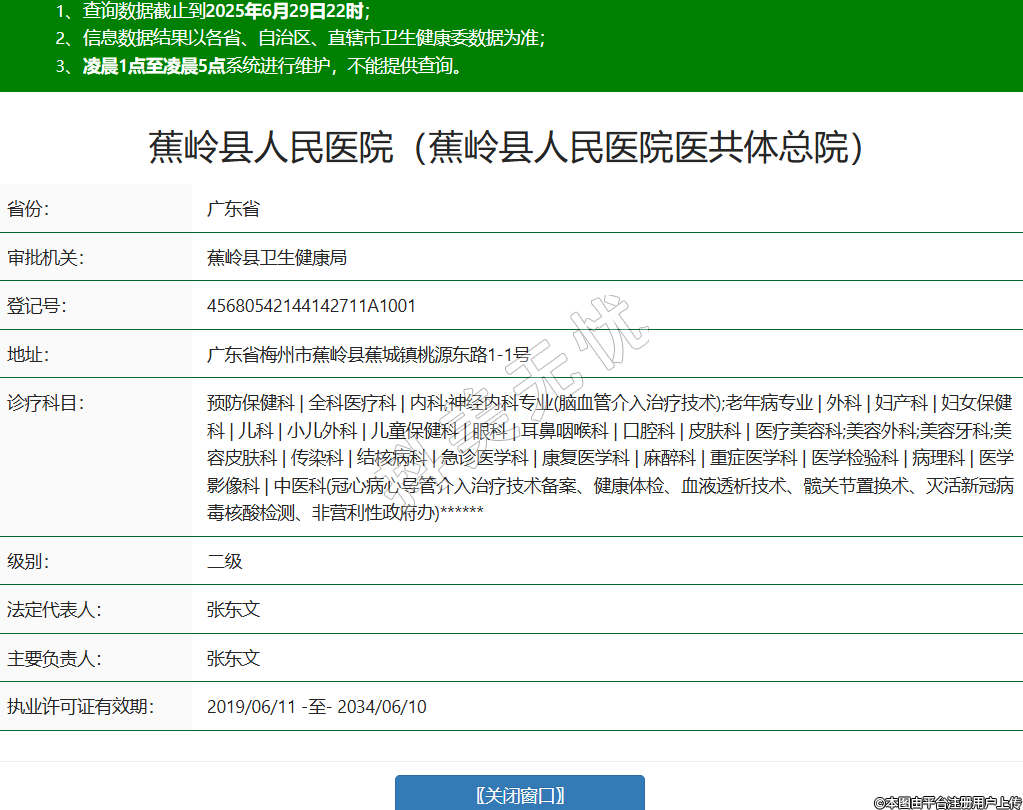 省份:广东省审批机关:蕉岭县卫生健康局登记号:45680542144142711A1001地址:广东省梅州市蕉岭县蕉城镇桃源东路1-1号诊疗科目:预防保健科 | 全科医疗科 | 内科;神经内科专业(脑血管介入治疗技术);老年病专业 | 外科 | 妇产科 | 妇女保健科 | 儿科 | 小儿外科 | 儿童保健科 | 眼科 | 耳鼻咽喉科 | 口腔科 | 皮肤科 | 医疗美容科;美容外科;美容牙科;美容皮肤科 | 传染科 | 结核病科 | 急诊医学科 | 康复医学科 | 麻醉科 | 重症医学科 | 医学检验科 | 病理科 | 医学影像科 | 中医科(冠心病心导管介入治疗技术备案、健康体检、血液透析技术、髋关节置换术、灭活新冠病毒核酸检测、非营利性政府办)******级别:二级法定代表人:张东文主要负责人:张东文执业许可证有效期:2019/06/11 -至- 2034/06/10 -