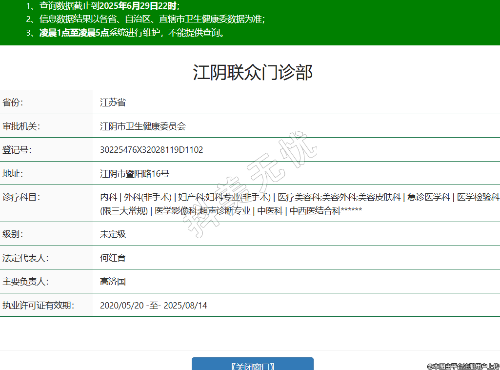 江阴联众门诊部,诊疗科目:内科 | 外科(非手术) | 妇产科;妇科专业(非手术) | 医疗美容科;美容外科;美容皮肤科 | 急诊医学科 | 医学检验科(限三大常规) | 医学影像科;超声诊断专业 | 中医科 | 中西医结合科******