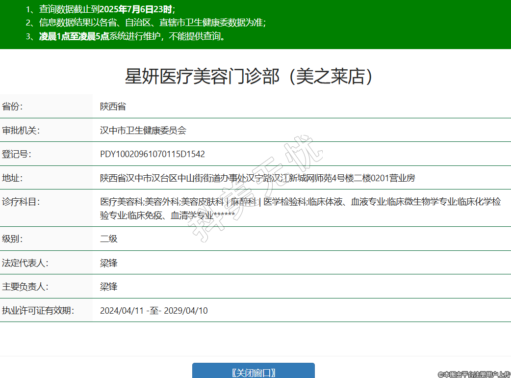 汉中星妍医疗美容(美之莱店)诊疗科目:医疗美容科;美容外科;美容皮肤科 | 麻醉科 | 医学检验科;临床体液、血液专业;临床微生物学专业;临床化学检验专业;临床免疫、血清学专业******