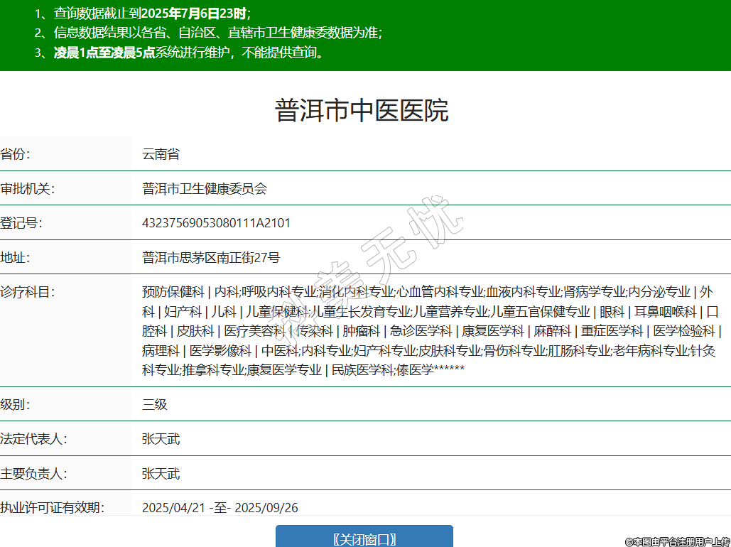 省份:云南省审批机关:普洱市卫生健康委员会登记号:43237569053080111A2101地址:普洱市思茅区南正街27号诊疗科目:预防保健科 | 内科;呼吸内科专业;消化内科专业;心血管内科专业;血液内科专业;肾病学专业;内分泌专业 | 外科 | 妇产科 | 儿科 | 儿童保健科;儿童生长发育专业;儿童营养专业;儿童五官保健专业 | 眼科 | 耳鼻咽喉科 | 口腔科 | 皮肤科 | 医疗美容科 | 传染科 | 肿瘤科 | 急诊医学科 | 康复医学科 | 麻醉科 | 重症医学科 | 医学检验科 | 病理科 | 医学影像科 | 中医科;内科专业;妇产科专业;皮肤科专业;骨伤科专业;肛肠科专业;老年病科专业;针灸科专业;推拿科专业;康复医学专业 | 民族医学科;傣医学******级别:三级法定代表人:张天武主要负责人:张天武执业许可证有效期:2025/04/21 -至- 2025/09/26 -