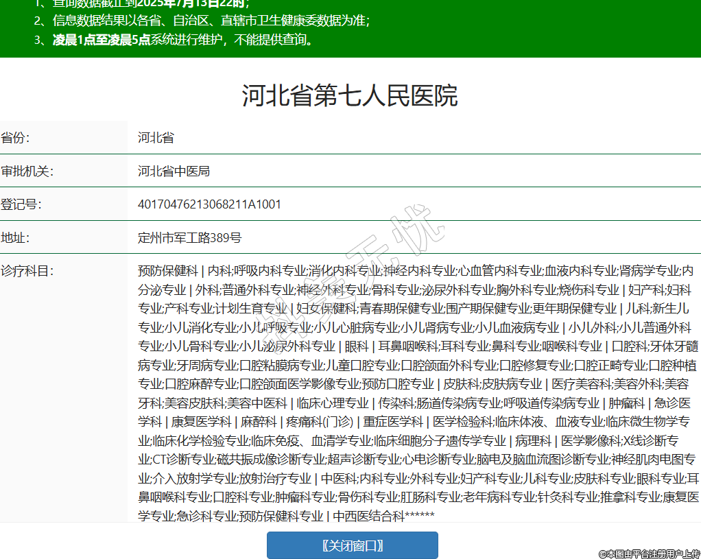 省份:河北省审批机关:河北省中医局登记号:40170476213068211A1001地址:定州市军工路389号诊疗科目:预防保健科 | 内科;呼吸内科专业;消化内科专业;神经内科专业;心血管内科专业;血液内科专业;肾病学专业;内分泌专业 | 外科;普通外科专业;神经外科专业;骨科专业;泌尿外科专业;胸外科专业;烧伤科专业 | 妇产科;妇科专业;产科专业;计划生育专业 | 妇女保健科;青春期保健专业;围产期保健专业;更年期保健专业 | 儿科;新生儿专业;小儿消化专业;小儿呼吸专业;小儿心脏病专业;小儿肾病专业;小儿血液病专业 | 小儿外科;小儿普通外科专业;小儿骨科专业;小儿泌尿外科专业 | 眼科 | 耳鼻咽喉科;耳科专业;鼻科专业;咽喉科专业 | 口腔科;牙体牙髓病专业;牙周病专业;口腔粘膜病专业;儿童口腔专业;口腔颌面外科专业;口腔修复专业;口腔正畸专业;口腔种植专业;口腔麻醉专业;口腔颌面医学影像专业;预防口腔专业 | 皮肤科;皮肤病专业 | 医疗美容科;美容外科;美容牙科;美容皮肤科;美容中医科 | 临床心理专业 | 传染科;肠道传染病专业;呼吸道传染病专业 | 肿瘤科 | 急诊医学科 | 康复医学科 | 麻醉科 | 疼痛科(门诊) | 重症医学科 | 医学检验科;临床体液、血液专业;临床微生物学专业;临床化学检验专业;临床免疫、血清学专业;临床细胞分子遗传学专业 | 病理科 | 医学影像科;X线诊断专业;CT诊断专业;磁共振成像诊断专业;超声诊断专业;心电诊断专业;脑电及脑血流图诊断专业;神经肌肉电图专业;介入放射学专业;放射治疗专业 | 中医科;内科专业;外科专业;妇产科专业;儿科专业;皮肤科专业;眼科专业;耳鼻咽喉科专业;口腔科专业;肿瘤科专业;骨伤科专业;肛肠科专业;老年病科专业;针灸科专业;推拿科专业;康复医学专业;急诊科专业;预防保健科专业 | 中西医结合科******级别:三级法定代表人:王鹏主要负责人:执业许可证有效期:2022/06/16 -至- 2036/08/22 -