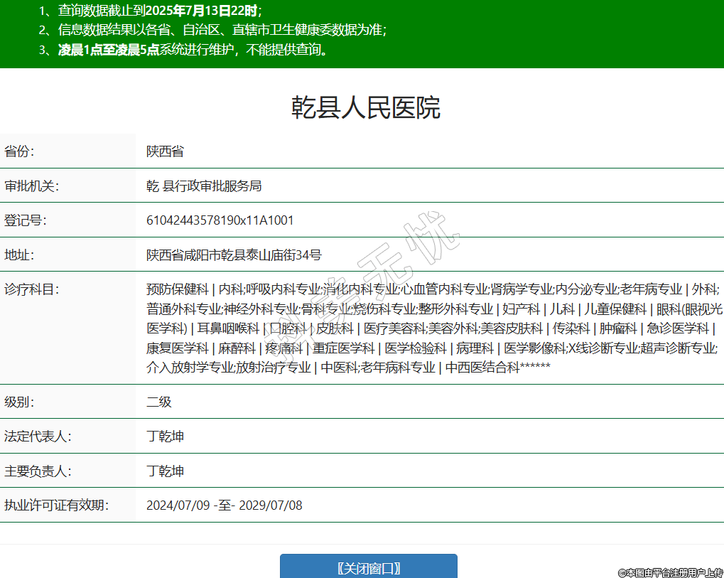 省份:陕西省审批机关:乾 县行政审批服务局登记号:61042443578190x11A1001地址:陕西省咸阳市乾县泰山庙街34号诊疗科目:预防保健科 | 内科;呼吸内科专业;消化内科专业;心血管内科专业;肾病学专业;内分泌专业;老年病专业 | 外科;普通外科专业;神经外科专业;骨科专业;烧伤科专业;整形外科专业 | 妇产科 | 儿科 | 儿童保健科 | 眼科(眼视光医学科) | 耳鼻咽喉科 | 口腔科 | 皮肤科 | 医疗美容科;美容外科;美容皮肤科 | 传染科 | 肿瘤科 | 急诊医学科 | 康复医学科 | 麻醉科 | 疼痛科 | 重症医学科 | 医学检验科 | 病理科 | 医学影像科;X线诊断专业;超声诊断专业;介入放射学专业;放射治疗专业 | 中医科;老年病科专业 | 中西医结合科******级别:二级法定代表人:丁乾坤主要负责人:丁乾坤执业许可证有效期:2024/07/09 -至- 2029/07/08 -