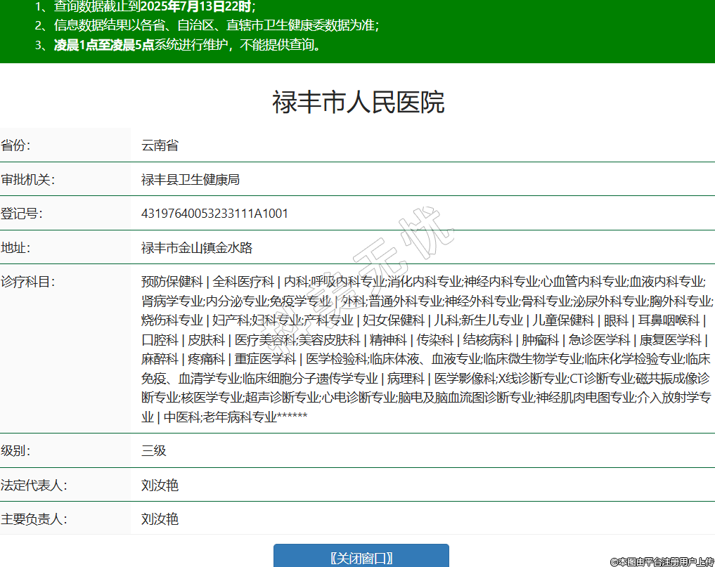 省份:云南省审批机关:禄丰县卫生健康局登记号:43197640053233111A1001地址:禄丰市金山镇金水路诊疗科目:预防保健科 | 全科医疗科 | 内科;呼吸内科专业;消化内科专业;神经内科专业;心血管内科专业;血液内科专业;肾病学专业;内分泌专业;免疫学专业 | 外科;普通外科专业;神经外科专业;骨科专业;泌尿外科专业;胸外科专业;烧伤科专业 | 妇产科;妇科专业;产科专业 | 妇女保健科 | 儿科;新生儿专业 | 儿童保健科 | 眼科 | 耳鼻咽喉科 | 口腔科 | 皮肤科 | 医疗美容科;美容皮肤科 | 精神科 | 传染科 | 结核病科 | 肿瘤科 | 急诊医学科 | 康复医学科 | 麻醉科 | 疼痛科 | 重症医学科 | 医学检验科;临床体液、血液专业;临床微生物学专业;临床化学检验专业;临床免疫、血清学专业;临床细胞分子遗传学专业 | 病理科 | 医学影像科;X线诊断专业;CT诊断专业;磁共振成像诊断专业;核医学专业;超声诊断专业;心电诊断专业;脑电及脑血流图诊断专业;神经肌肉电图专业;介入放射学专业 | 中医科;老年病科专业******级别:三级法定代表人:刘汝艳主要负责人:刘汝艳执业许可证有效期:2023/09/15 -至- 2037/12/30 -