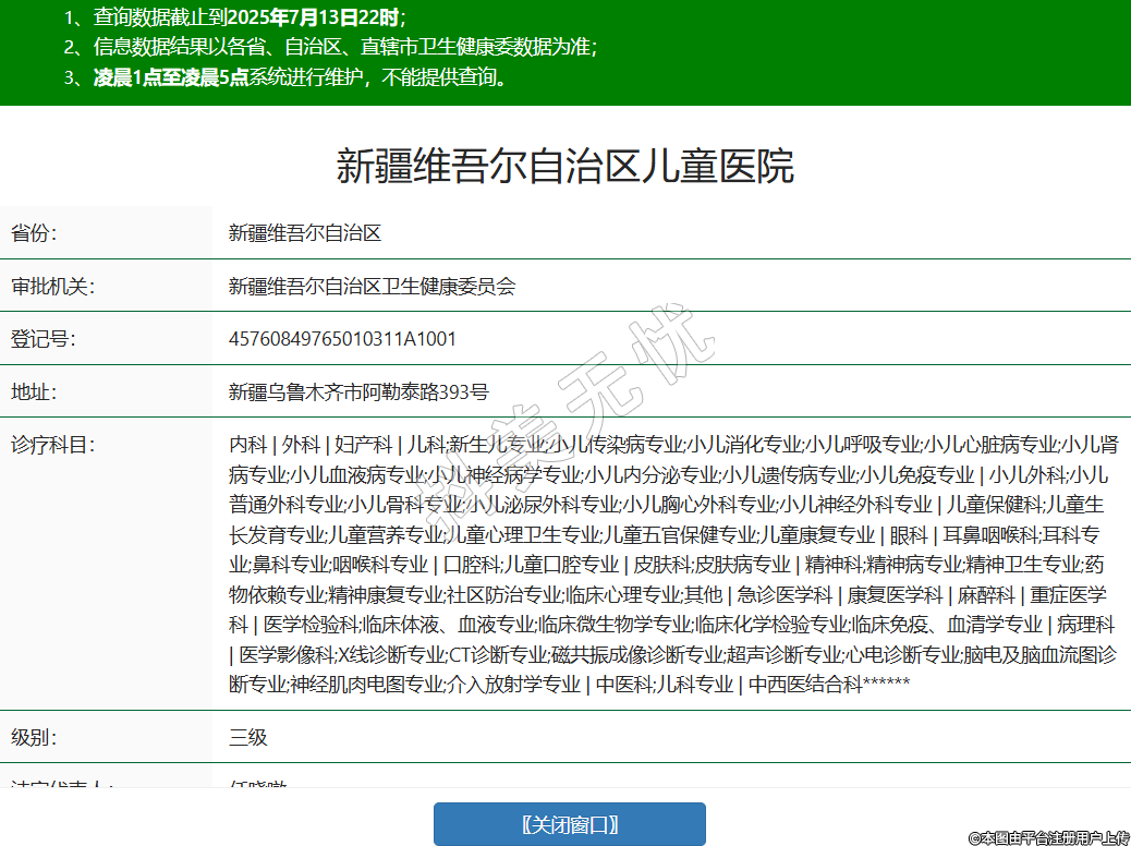 省份:新疆维吾尔自治区审批机关:新疆维吾尔自治区卫生健康委员会登记号:45760849765010311A1001地址:新疆乌鲁木齐市阿勒泰路393号诊疗科目:内科 | 外科 | 妇产科 | 儿科;新生儿专业;小儿传染病专业;小儿消化专业;小儿呼吸专业;小儿心脏病专业;小儿肾病专业;小儿血液病专业;小儿神经病学专业;小儿内分泌专业;小儿遗传病专业;小儿免疫专业 | 小儿外科;小儿普通外科专业;小儿骨科专业;小儿泌尿外科专业;小儿胸心外科专业;小儿神经外科专业 | 儿童保健科;儿童生长发育专业;儿童营养专业;儿童心理卫生专业;儿童五官保健专业;儿童康复专业 | 眼科 | 耳鼻咽喉科;耳科专业;鼻科专业;咽喉科专业 | 口腔科;儿童口腔专业 | 皮肤科;皮肤病专业 | 精神科;精神病专业;精神卫生专业;药物依赖专业;精神康复专业;社区防治专业;临床心理专业;其他 | 急诊医学科 | 康复医学科 | 麻醉科 | 重症医学科 | 医学检验科;临床体液、血液专业;临床微生物学专业;临床化学检验专业;临床免疫、血清学专业 | 病理科 | 医学影像科;X线诊断专业;CT诊断专业;磁共振成像诊断专业;超声诊断专业;心电诊断专业;脑电及脑血流图诊断专业;神经肌肉电图专业;介入放射学专业 | 中医科;儿科专业 | 中西医结合科******级别:三级法定代表人:任晓暾主要负责人:任晓暾执业许可证有效期:2017/05/08 -至- 2032/05/07 -