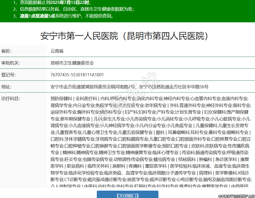 省份:云南省审批机关:昆明市卫生健康委员会登记号:76707435-553018111A1001地址:安宁市金方街道望湖居民委员会钢河南路2号、安宁市连然街道金方社区中华路58号诊疗科目:预防保健科 | 全科医疗科 | 内科;呼吸内科专业;消化内科专业;神经内科专业;心血管内科专业;血液内科专业;肾病学专业;内分泌专业;免疫学专业;变态反应专业;老年病专业 | 外科;普通外科专业;神经外科专业;骨科专业;泌尿外科专业;胸外科专业;烧伤科专业 | 妇产科;妇科专业;产科专业;计划生育专业 | 妇女保健科;围产期保健专业;更年期保健专业 | 儿科;新生儿专业;小儿传染病专业;小儿消化专业;小儿呼吸专业;小儿心脏病专业;小儿肾病专业;小儿血液病专业;小儿神经病学专业;小儿内分泌专业;小儿免疫专业 | 儿童保健科;儿童生长发育专业;儿童营养专业;儿童心理卫生专业;儿童五官保健专业 | 眼科 | 耳鼻咽喉科;耳科专业;鼻科专业;咽喉科专业 | 口腔科;牙体牙髓病专业;牙周病专业;口腔粘膜病专业;儿童口腔专业;口腔颌面外科专业;口腔修复专业;口腔正畸专业;口腔种植专业;口腔麻醉专业;口腔颌面医学影像专业;预防口腔专业 | 皮肤科;皮肤病专业;性传播疾病专业 | 精神科;精神病专业;精神卫生专业;精神康复专业;临床心理专业 | 传染科;肠道传染病专业;呼吸道传染病专业;肝炎专业;虫媒传染病专业;动物源性传染病专业;蠕虫病专业 | 结核病科 | 肿瘤科 | 急诊医学科 | 康复医学科 | 职业病科 | 临终关怀科 | 麻醉科 | 疼痛科 | 重症医学科 | 医学检验科;临床体液、血液专业;临床微生物学专业;临床化学检验专业;临床免疫、血清学专业;临床细胞分子遗传学专业 | 病理科 | 医学影像科;X线诊断专业;CT诊断专业;磁共振成像诊断专业;核医学专业;超声诊断专业;心电诊断专业;脑电及脑血流图诊断专业;介入放射学专业 | 中医科;内科专业;外科专业;肛肠科专业;针灸科专业;推拿科专业;康复医学专业 | 中西医结合科******级别:三级法定代表人:宋超主要负责人:宋超执业许可证有效期:2025/04/01 -至- 2037/11/20 -