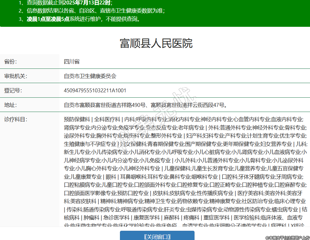 省份:四川省审批机关:自贡市卫生健康委员会登记号:45094795551032211A1001地址:自贡市富顺县富世街道吉祥路490号、富顺县富世街道祥云街西段47号。诊疗科目:预防保健科 | 全科医疗科 | 内科;呼吸内科专业;消化内科专业;神经内科专业;心血管内科专业;血液内科专业;肾病学专业;内分泌专业;免疫学专业;变态反应专业;老年病专业 | 外科;普通外科专业;神经外科专业;骨科专业;泌尿外科专业;胸外科专业;烧伤科专业;整形外科专业 | 妇产科;妇科专业;产科专业;计划生育专业;优生学专业;生殖健康与不孕症专业 | 妇女保健科;青春期保健专业;围产期保健专业;更年期保健专业;妇女营养专业 | 儿科;新生儿专业;小儿传染病专业;小儿消化专业;小儿呼吸专业;小儿心脏病专业;小儿肾病专业;小儿血液病专业;小儿神经病学专业;小儿内分泌专业;小儿免疫专业 | 小儿外科;小儿普通外科专业;小儿骨科专业;小儿泌尿外科专业;小儿胸心外科专业;小儿神经外科专业 | 儿童保健科;儿童生长发育专业;儿童营养专业;儿童五官保健专业;儿童康复专业 | 眼科 | 耳鼻咽喉科;耳科专业;鼻科专业;咽喉科专业 | 口腔科;牙体牙髓病专业;牙周病专业;口腔粘膜病专业;儿童口腔专业;口腔颌面外科专业;口腔修复专业;口腔正畸专业;口腔种植专业;口腔麻醉专业;口腔颌面医学影像专业;预防口腔专业 | 皮肤科;皮肤病专业;性传播疾病专业 | 医疗美容科;美容外科;美容牙科;美容皮肤科 | 精神科;精神病专业;精神卫生专业;药物依赖专业;精神康复专业;社区防治专业;临床心理专业 | 传染科;肠道传染病专业;呼吸道传染病专业;肝炎专业;虫媒传染病专业;动物源性传染病专业;蠕虫病专业 | 结核病科 | 肿瘤科 | 急诊医学科 | 康复医学科 | 麻醉科 | 疼痛科 | 重症医学科 | 医学检验科;临床体液、血液专业;临床微生物学专业;临床化学检验专业;临床免疫、血清学专业;临床细胞分子遗传学专业 | 病理科 | X线诊断专业;CT诊断专业;磁共振成像诊断专业;超声诊断专业;心电诊断专业;脑电及脑血流图诊断专业;神经肌肉电图专业;介入放射学专业;放射治疗专业 | 中医科;内科专业;外科专业;妇产科专业;儿科专业;皮肤科专业;肿瘤科专业;骨伤科专业;肛肠科专业;老年病科专业;针灸科专业;推拿科专业;康复医学专业;预防保健科专业 | 中西医结合科******级别:三级法定代表人:高凌燕主要负责人:高凌燕执业许可证有效期:2012/12/28 -至- 2027/12/27 -