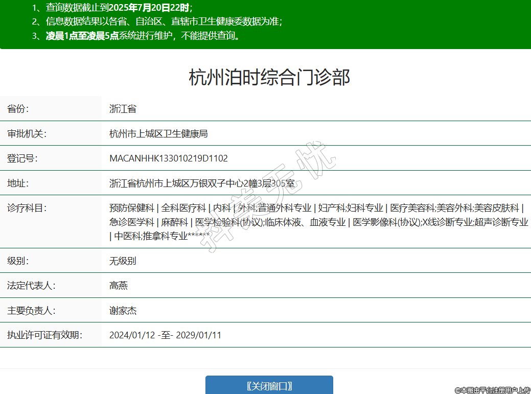 省份:浙江省审批机关:杭州市上城区卫生健康局登记号:MACANHHK133010219D1102地址:浙江省杭州市上城区万银双子中心2幢3层305室诊疗科目:预防保健科 | 全科医疗科 | 内科 | 外科;普通外科专业 | 妇产科;妇科专业 | 医疗美容科;美容外科;美容皮肤科 | 急诊医学科 | 麻醉科 | 医学检验科(协议);临床体液、血液专业 | 医学影像科(协议);X线诊断专业;超声诊断专业 | 中医科;推拿科专业******级别:无级别法定代表人:高燕主要负责人:谢家杰执业许可证有效期:2024/01/12 -至- 2029/01/11 -