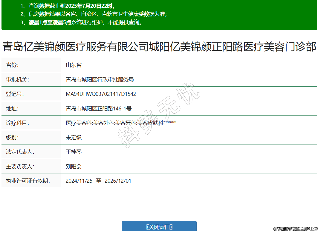 青岛亿美锦颜医疗服务有限公司城阳亿美锦颜正阳路医疗美容门诊部,诊疗科目:医疗美容科;美容外科;美容牙科;美容皮肤科******