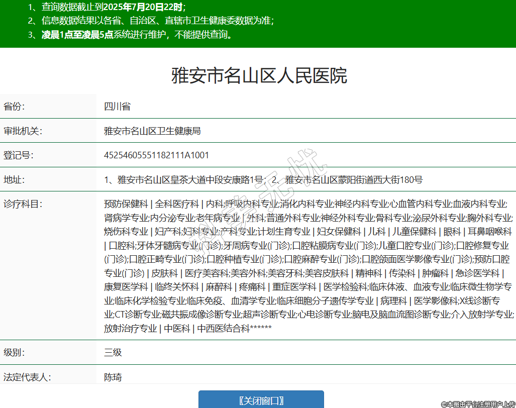 省份:四川省审批机关:雅安市名山区卫生健康局登记号:45254605551182111A1001地址:1、雅安市名山区皇茶大道中段安康路1号;2、雅安市名山区蒙阳街道西大街180号诊疗科目:预防保健科 | 全科医疗科 | 内科;呼吸内科专业;消化内科专业;神经内科专业;心血管内科专业;血液内科专业;肾病学专业;内分泌专业;老年病专业 | 外科;普通外科专业;神经外科专业;骨科专业;泌尿外科专业;胸外科专业;烧伤科专业 | 妇产科;妇科专业;产科专业;计划生育专业 | 妇女保健科 | 儿科 | 儿童保健科 | 眼科 | 耳鼻咽喉科 | 口腔科;牙体牙髓病专业(门诊);牙周病专业(门诊);口腔粘膜病专业(门诊);儿童口腔专业(门诊);口腔修复专业(门诊);口腔正畸专业(门诊);口腔种植专业(门诊);口腔麻醉专业(门诊);口腔颌面医学影像专业(门诊);预防口腔专业(门诊) | 皮肤科 | 医疗美容科;美容外科;美容牙科;美容皮肤科 | 精神科 | 传染科 | 肿瘤科 | 急诊医学科 | 康复医学科 | 临终关怀科 | 麻醉科 | 疼痛科 | 重症医学科 | 医学检验科;临床体液、血液专业;临床微生物学专业;临床化学检验专业;临床免疫、血清学专业;临床细胞分子遗传学专业 | 病理科 | 医学影像科;X线诊断专业;CT诊断专业;磁共振成像诊断专业;超声诊断专业;心电诊断专业;脑电及脑血流图诊断专业;介入放射学专业;放射治疗专业 | 中医科 | 中西医结合科******级别:三级法定代表人:陈琦主要负责人:陈琦执业许可证有效期:2020/08/07 -至- 2035/08/06 -
