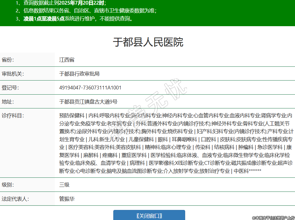 省份:江西省审批机关:于都县行政审批局登记号:49194047-736073111A1001地址:于都县贡江镇盘古大道9号诊疗科目:预防保健科 | 内科;呼吸内科专业;消化内科专业;神经内科专业;心血管内科专业;血液内科专业;肾病学专业;内分泌专业;免疫学专业;老年病专业 | 外科;普通外科专业(内镜诊疗技术);神经外科专业;骨科专业(人工髋关节置换术);泌尿外科专业(内镜诊疗技术);胸外科专业;烧伤科专业 | 妇产科;妇科专业(内镜诊疗技术);产科专业;计划生育专业 | 儿科;新生儿专业 | 儿童保健科 | 眼科 | 耳鼻咽喉科 | 口腔科 | 皮肤科;皮肤病专业;性传播疾病专业 | 医疗美容科;美容外科;美容皮肤科 | 精神科;临床心理专业 | 传染科 | 结核病科 | 肿瘤科 | 急诊医学科 | 康复医学科 | 麻醉科 | 疼痛科 | 重症医学科 | 医学检验科;临床体液、血液专业;临床微生物学专业;临床化学检验专业;临床免疫、血清学专业 | 病理科 | 医学影像科;X线诊断专业;CT诊断专业;磁共振成像诊断专业;超声诊断专业;心电诊断专业;脑电及脑血流图诊断专业;介入放射学专业;放射治疗专业 | 中医科******级别:三级法定代表人:管振华主要负责人:管振华执业许可证有效期:2024/10/21 -至- 2037/05/13 -