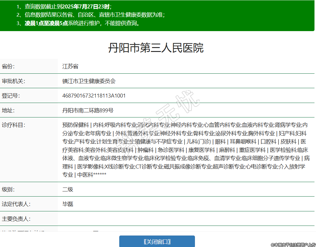 省份:江苏省审批机关:镇江市卫生健康委员会登记号:46879016732118113A1001地址:丹阳市南二环路899号诊疗科目:预防保健科 | 内科;呼吸内科专业;消化内科专业;神经内科专业;心血管内科专业;血液内科专业;肾病学专业;内分泌专业;老年病专业 | 外科;普通外科专业;神经外科专业;骨科专业;泌尿外科专业;胸外科专业 | 妇产科;妇科专业;产科专业;计划生育专业;生殖健康与不孕症专业 | 儿科(门诊) | 眼科 | 耳鼻咽喉科 | 口腔科 | 皮肤科 | 医疗美容科;美容外科;美容皮肤科 | 肿瘤科 | 急诊医学科 | 康复医学科 | 麻醉科 | 重症医学科 | 医学检验科;临床体液、血液专业;临床微生物学专业;临床化学检验专业;临床免疫、血清学专业;临床细胞分子遗传学专业 | 病理科 | 医学影像科;X线诊断专业;CT诊断专业;磁共振成像诊断专业;超声诊断专业;心电诊断专业;介入放射学专业 | 中医科******级别:二级法定代表人:毕磊主要负责人:执业许可证有效期:2025/03/03 -至- 2034/05/29 -