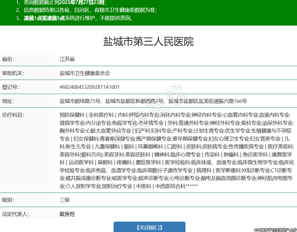 省份:江苏省审批机关:盐城市卫生健康委员会登记号:46824884532092811A1001地址:盐城市剧场路75号、盐城市盐都区新都西路2号、盐城市盐都区盐龙街道振兴路166号诊疗科目:预防保健科 | 全科医疗科 | 内科;呼吸内科专业;消化内科专业;神经内科专业;心血管内科专业;血液内科专业;肾病学专业;内分泌专业;免疫学专业;老年病专业 | 外科;普通外科专业;神经外科专业;骨科专业;泌尿外科专业;胸外科专业;心脏大血管外科专业 | 妇产科;妇科专业;产科专业;计划生育专业;优生学专业;生殖健康与不孕症专业 | 妇女保健科;青春期保健专业;围产期保健专业;更年期保健专业;妇女心理卫生专业;妇女营养专业 | 儿科;新生儿专业 | 儿童保健科 | 眼科 | 耳鼻咽喉科 | 口腔科 | 皮肤科;皮肤病专业;性传播疾病专业 | 医疗美容科;美容外科(眼科方向);美容牙科;美容皮肤科 | 精神科;临床心理专业 | 传染科 | 肿瘤科 | 急诊医学科 | 康复医学科 | 运动医学科 | 麻醉科 | 疼痛科 | 重症医学科 | 医学检验科;临床体液、血液专业;临床微生物学专业;临床化学检验专业;临床免疫、血清学专业;临床细胞分子遗传学专业 | 病理科 | 医学影像科;X线诊断专业;CT诊断专业;磁共振成像诊断专业;核医学专业;超声诊断专业;心电诊断专业;脑电及脑血流图诊断专业;神经肌肉电图专业;介入放射学专业;放射治疗专业 | 中医科 | 中西医结合科******级别:三级法定代表人:戴真煜主要负责人:戴真煜执业许可证有效期:2021/12/18 -至- 2036/12/18 -