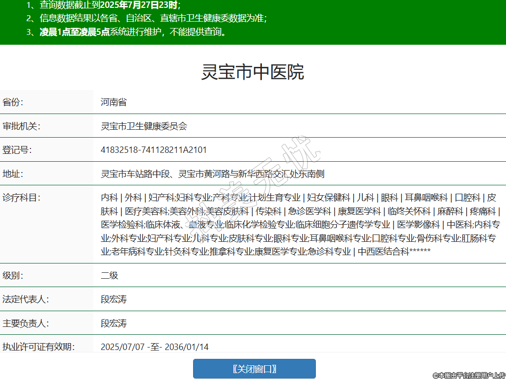 省份:河南省审批机关:灵宝市卫生健康委员会登记号:41832518-741128211A2101地址:灵宝市车站路中段、灵宝市黄河路与新华西路交汇处东南侧诊疗科目:内科 | 外科 | 妇产科;妇科专业;产科专业;计划生育专业 | 妇女保健科 | 儿科 | 眼科 | 耳鼻咽喉科 | 口腔科 | 皮肤科 | 医疗美容科;美容外科;美容皮肤科 | 传染科 | 急诊医学科 | 康复医学科 | 临终关怀科 | 麻醉科 | 疼痛科 | 医学检验科;临床体液、血液专业;临床化学检验专业;临床细胞分子遗传学专业 | 医学影像科 | 中医科;内科专业;外科专业;妇产科专业;儿科专业;皮肤科专业;眼科专业;耳鼻咽喉科专业;口腔科专业;骨伤科专业;肛肠科专业;老年病科专业;针灸科专业;推拿科专业;康复医学专业;急诊科专业 | 中西医结合科******级别:二级法定代表人:段宏涛主要负责人:段宏涛执业许可证有效期:2025/07/07 -至- 2036/01/14 -