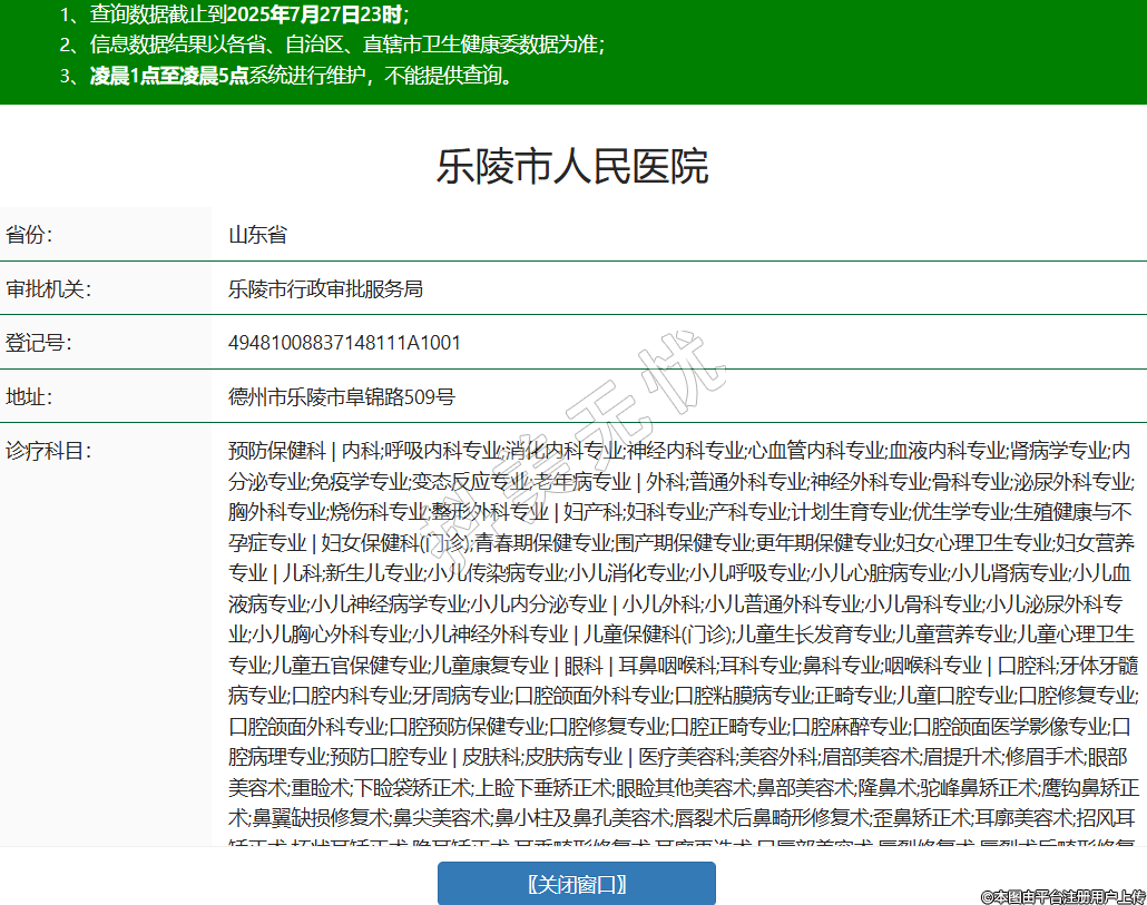 省份:山东省审批机关:乐陵市行政审批服务局登记号:49481008837148111A1001地址:德州市乐陵市阜锦路509号诊疗科目:预防保健科 | 内科;呼吸内科专业;消化内科专业;神经内科专业;心血管内科专业;血液内科专业;肾病学专业;内分泌专业;免疫学专业;变态反应专业;老年病专业 | 外科;普通外科专业;神经外科专业;骨科专业;泌尿外科专业;胸外科专业;烧伤科专业;整形外科专业 | 妇产科;妇科专业;产科专业;计划生育专业;优生学专业;生殖健康与不孕症专业 | 妇女保健科(门诊);青春期保健专业;围产期保健专业;更年期保健专业;妇女心理卫生专业;妇女营养专业 | 儿科;新生儿专业;小儿传染病专业;小儿消化专业;小儿呼吸专业;小儿心脏病专业;小儿肾病专业;小儿血液病专业;小儿神经病学专业;小儿内分泌专业 | 小儿外科;小儿普通外科专业;小儿骨科专业;小儿泌尿外科专业;小儿胸心外科专业;小儿神经外科专业 | 儿童保健科(门诊);儿童生长发育专业;儿童营养专业;儿童心理卫生专业;儿童五官保健专业;儿童康复专业 | 眼科 | 耳鼻咽喉科;耳科专业;鼻科专业;咽喉科专业 | 口腔科;牙体牙髓病专业;口腔内科专业;牙周病专业;口腔颌面外科专业;口腔粘膜病专业;正畸专业;儿童口腔专业;口腔修复专业;口腔颌面外科专业;口腔预防保健专业;口腔修复专业;口腔正畸专业;口腔麻醉专业;口腔颌面医学影像专业;口腔病理专业;预防口腔专业 | 皮肤科;皮肤病专业 | 医疗美容科;美容外科;眉部美容术;眉提升术;修眉手术;眼部美容术;重睑术;下睑袋矫正术;上睑下垂矫正术;眼睑其他美容术;鼻部美容术;隆鼻术;驼峰鼻矫正术;鹰钩鼻矫正术;鼻翼缺损修复术;鼻尖美容术;鼻小柱及鼻孔美容术;唇裂术后鼻畸形修复术;歪鼻矫正术;耳廓美容术;招风耳矫正术;杯状耳矫正术;隐耳矫正术;耳垂畸形修复术;耳廓再造术;口唇部美容术;唇裂修复术;唇裂术后畸形修复术;重唇美容术;唇峰、薄唇增厚美容术;唇珠美容术;口角成形术;酒窝成形术;唇系带延长成形术;颌面部美容术;颞部填充术;颧部美容术;颏成形术;下颌角肥大矫正术;面部除皱术;额部除皱术;颞部除皱术;面颈部除皱术;中面部除皱术;额颞部除皱术;额颞面部除皱术;颞面颈部除皱术;全面颈部除皱术;内窥镜除皱术;面部悬吊除皱术;乳房美容术;隆乳术;乳房肥大缩小术;乳头内陷矫正术;乳头肥大缩小术;乳房下垂矫正术;乳头乳晕重建术;脂肪抽吸及腹壁成形术;负压脂肪抽吸术;超声脂肪抽吸术;电子吸脂术;注射器法吸脂术;腹壁成形术;会阴部美容术;处女膜修复术;阴道松弛缩紧术;阴蒂肥大缩小术;小阴唇肥大缩小术;包皮环切术;阴茎延长术;美容皮肤科;美容皮肤术(外科);诊断技术;真菌镜检技术;斑贴试验技术;皮肤活检术;治疗技术;糖皮质激素皮损内注射;药物加压治疗;外用药物治疗;光化学疗法;美容皮肤术(内科);皮肤磨削术;酒渣鼻切割术;皮肤肿物切除术;拔甲术;刮除术;自体表皮移植术;腋臭手术;足病修治术;毛发移植术;美容医疗应用技术;物理美容治疗术;激光美容治疗术;高频电美容治疗;冷冻美容治疗;其他物理美容治疗;脱毛术;穿耳孔术;注射美容技术;A型肉毒毒素美容注射技术;皮肤(软组织)注射(填充)美容;美容文饰技术;文眉技术;文眼线技术;文唇技术;不良文饰修复技术 | 精神科(门诊) | 传染科;肠道传染病专业;呼吸道传染病专业;肝炎专业;虫媒传染病专业;动物源性传染病专业;蠕虫病专业 | 结核病科 | 肿瘤科 | 急诊医学科 | 康复医学科 | 临终关怀科 | 麻醉科 | 疼痛科 | 重症医学科 | 医学检验科;临床体液、血液专业;临床微生物学专业;临床化学检验专业;临床免疫、血清学专业;临床细胞分子遗传学专业 | 病理科 | 医学影像科;X线诊断专业;CT诊断专业;磁共振成像诊断专业;超声诊断专业;心电诊断专业;脑电及脑血流图诊断专业;神经肌肉电图专业;介入放射学专业 | 中医科;内科专业;外科专业;妇产科专业;儿科专业;皮肤科专业;肿瘤科专业;老年病科专业;针灸科专业;推拿科专业;康复医学专业;预防保健科专业 | 中西医结合科(门诊)******级别:二级法定代表人:王静主要负责人:王静执业许可证有效期:2024/10/25 -至- 2035/09/10 -