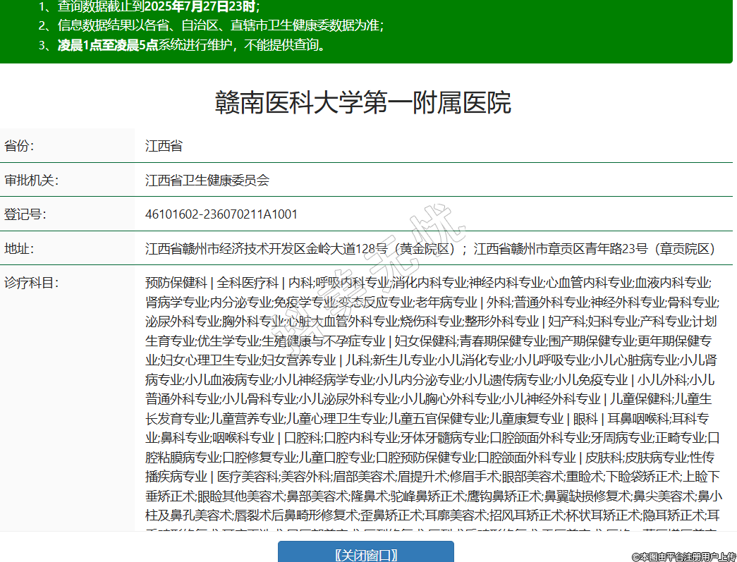 省份:江西省审批机关:江西省卫生健康委员会登记号:46101602-236070211A1001地址:江西省赣州市经济技术开发区金岭大道128号(黄金院区);江西省赣州市章贡区青年路23号(章贡院区)诊疗科目:预防保健科 | 全科医疗科 | 内科;呼吸内科专业;消化内科专业;神经内科专业;心血管内科专业;血液内科专业;肾病学专业;内分泌专业;免疫学专业;变态反应专业;老年病专业 | 外科;普通外科专业;神经外科专业;骨科专业;泌尿外科专业;胸外科专业;心脏大血管外科专业;烧伤科专业;整形外科专业 | 妇产科;妇科专业;产科专业;计划生育专业;优生学专业;生殖健康与不孕症专业 | 妇女保健科;青春期保健专业;围产期保健专业;更年期保健专业;妇女心理卫生专业;妇女营养专业 | 儿科;新生儿专业;小儿消化专业;小儿呼吸专业;小儿心脏病专业;小儿肾病专业;小儿血液病专业;小儿神经病学专业;小儿内分泌专业;小儿遗传病专业;小儿免疫专业 | 小儿外科;小儿普通外科专业;小儿骨科专业;小儿泌尿外科专业;小儿胸心外科专业;小儿神经外科专业 | 儿童保健科;儿童生长发育专业;儿童营养专业;儿童心理卫生专业;儿童五官保健专业;儿童康复专业 | 眼科 | 耳鼻咽喉科;耳科专业;鼻科专业;咽喉科专业 | 口腔科;口腔内科专业;牙体牙髓病专业;口腔颌面外科专业;牙周病专业;正畸专业;口腔粘膜病专业;口腔修复专业;儿童口腔专业;口腔预防保健专业;口腔颌面外科专业 | 皮肤科;皮肤病专业;性传播疾病专业 | 医疗美容科;美容外科;眉部美容术;眉提升术;修眉手术;眼部美容术;重睑术;下睑袋矫正术;上睑下垂矫正术;眼睑其他美容术;鼻部美容术;隆鼻术;驼峰鼻矫正术;鹰钩鼻矫正术;鼻翼缺损修复术;鼻尖美容术;鼻小柱及鼻孔美容术;唇裂术后鼻畸形修复术;歪鼻矫正术;耳廓美容术;招风耳矫正术;杯状耳矫正术;隐耳矫正术;耳垂畸形修复术;耳廓再造术;口唇部美容术;唇裂修复术;唇裂术后畸形修复术;重唇美容术;唇峰、薄唇增厚美容术;唇珠美容术;口角成形术;酒窝成形术;唇系带延长成形术;颌面部美容术;颞部填充术;颧部美容术;颏成形术;面部除皱术;额部除皱术;颞部除皱术;面颈部除皱术;中面部除皱术;额颞部除皱术;额颞面部除皱术;颞面颈部除皱术;全面颈部除皱术;内窥镜除皱术;面部悬吊除皱术;乳房美容术;隆乳术;乳房肥大缩小术;乳头内陷矫正术;乳头肥大缩小术;乳房下垂矫正术;乳头乳晕重建术;脂肪抽吸及腹壁成形术;负压脂肪抽吸术;超声脂肪抽吸术;电子吸脂术;注射器法吸脂术;腹壁成形术;会阴部美容术;处女膜修复术;阴道松弛缩紧术;阴蒂肥大缩小术;小阴唇肥大缩小术;包皮环切术;阴茎延长术;美容牙科;牙齿美容修复技术;洁齿术;牙齿修形术;牙齿漂白术;复合树脂黏结修复技术;瓷贴面修复技术;桩冠修复技术;金属烤瓷冠桥修复技术;全瓷冠技术;自凝丙稀酸树脂临时冠技术;可摘局部义齿美容修复技术;全口义齿美容修复技术;即刻义齿美容修复技术;植牙美容修复技术;黏结铸造固定桥美容修复技术;柔性义龈美容修复技术;隐形义齿美容修复技术;套筒冠义齿美容修复技术;牙周美容技术操作;牙龈切除术;牙龈成形术;牙冠延长术;牙周骨手术;根尖向复位瓣术;侧向转位瓣术;双乳头瓣移位术;冠向复位瓣术;自体游离龈瓣移植术;牙周引导组织再生术;牙槽骨修整术;牙槽骨嵴修整术;牙槽嵴增高术;牙颌畸形美容矫治技术;机械性活动性矫治器矫治技术;功能性矫治器矫治技术;固定矫治技术;美容皮肤科;美容皮肤术(外科);诊断技术;真菌镜检技术;斑贴试验技术;皮肤活检术;治疗技术;糖皮质激素皮损内注射;药物加压治疗;外用药物治疗;光化学疗法;美容皮肤术(内科);皮肤磨削术;酒渣鼻切割术;皮肤肿物切除术;拔甲术;刮除术;自体表皮移植术;腋臭手术;足病修治术;医疗美容心理诊断及辅导;美容医疗应用技术;物理美容治疗术;激光美容治疗术;高频电美容治疗;冷冻美容治疗;其他物理美容治疗;脱毛术;穿耳孔术;注射美容技术;A型肉毒毒素美容注射技术;皮肤(软组织)注射(填充)美容;美容文饰技术;文眉技术;文眼线技术;文唇技术;不良文饰修复技术 | 精神科;精神病专业;精神卫生专业;精神康复专业;社区防治专业;临床心理专业 | 传染科;肠道传染病专业;呼吸道传染病专业;肝炎专业;虫媒传染病专业;动物源性传染病专业;蠕虫病专业 | 肿瘤科 | 急诊医学科 | 康复医学科 | 麻醉科 | 疼痛科 | 重症医学科 | 医学检验科;临床体液、血液专业;临床微生物学专业;临床化学检验专业;临床免疫、血清学专业;临床细胞分子遗传学专业 | 病理科 | 医学影像科;X线诊断专业;CT诊断专业;磁共振成像诊断专业;核医学专业;超声诊断专业;心电诊断专业;脑电及脑血流图诊断专业;神经肌肉电图专业;介入放射学专业;放射治疗专业 | 中医科;内科专业;妇产科专业;儿科专业;皮肤科专业;眼科专业;耳鼻咽喉科专业;口腔科专业;肿瘤科专业;骨伤科专业;肛肠科专业;老年病科专业;针灸科专业;推拿科专业;康复医学专业;预防保健科专业 | 中西医结合科******级别:三级法定代表人:邹晓峰主要负责人:邹晓峰执业许可证有效期:2024/10/08 -至- 2037/10/31 -
