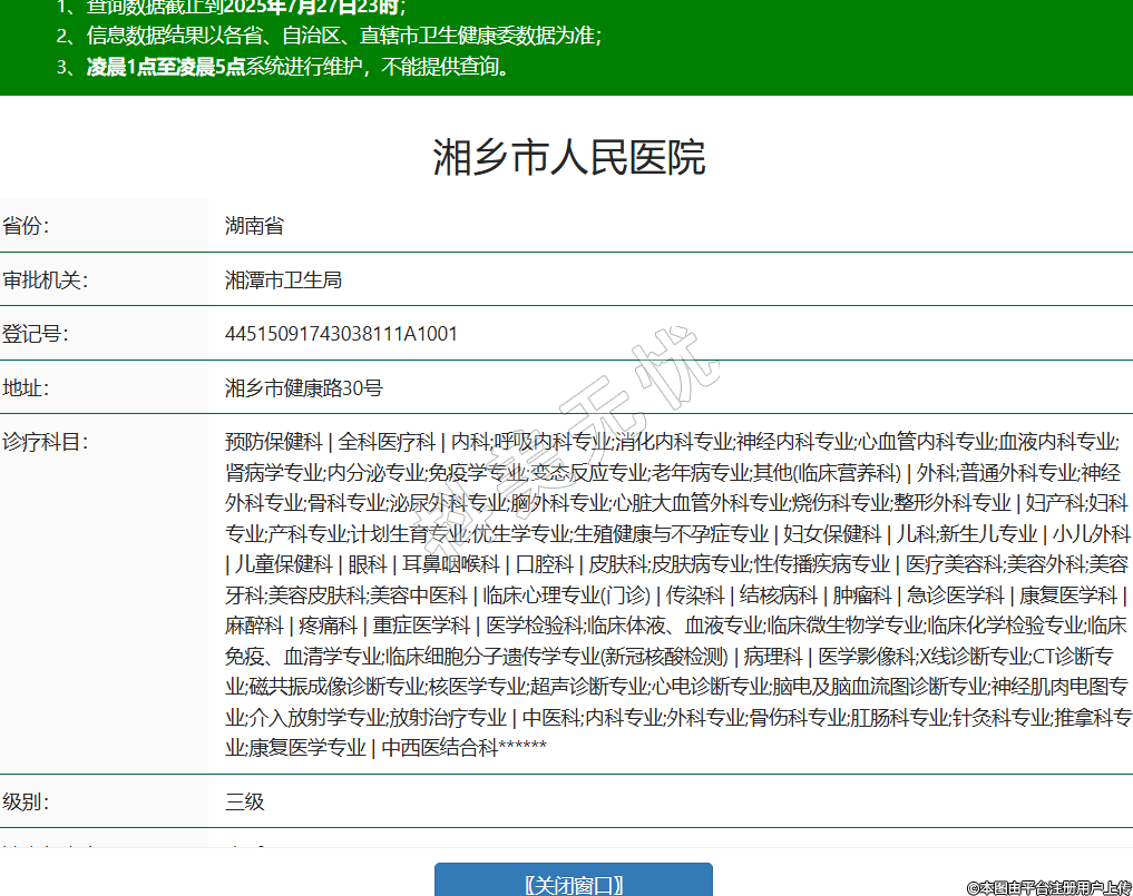 省份:湖南省审批机关:湘潭市卫生局登记号:44515091743038111A1001地址:湘乡市健康路30号诊疗科目:预防保健科 | 全科医疗科 | 内科;呼吸内科专业;消化内科专业;神经内科专业;心血管内科专业;血液内科专业;肾病学专业;内分泌专业;免疫学专业;变态反应专业;老年病专业;其他(临床营养科) | 外科;普通外科专业;神经外科专业;骨科专业;泌尿外科专业;胸外科专业;心脏大血管外科专业;烧伤科专业;整形外科专业 | 妇产科;妇科专业;产科专业;计划生育专业;优生学专业;生殖健康与不孕症专业 | 妇女保健科 | 儿科;新生儿专业 | 小儿外科 | 儿童保健科 | 眼科 | 耳鼻咽喉科 | 口腔科 | 皮肤科;皮肤病专业;性传播疾病专业 | 医疗美容科;美容外科;美容牙科;美容皮肤科;美容中医科 | 临床心理专业(门诊) | 传染科 | 结核病科 | 肿瘤科 | 急诊医学科 | 康复医学科 | 麻醉科 | 疼痛科 | 重症医学科 | 医学检验科;临床体液、血液专业;临床微生物学专业;临床化学检验专业;临床免疫、血清学专业;临床细胞分子遗传学专业(新冠核酸检测) | 病理科 | 医学影像科;X线诊断专业;CT诊断专业;磁共振成像诊断专业;核医学专业;超声诊断专业;心电诊断专业;脑电及脑血流图诊断专业;神经肌肉电图专业;介入放射学专业;放射治疗专业 | 中医科;内科专业;外科专业;骨伤科专业;肛肠科专业;针灸科专业;推拿科专业;康复医学专业 | 中西医结合科******级别:三级法定代表人:李昕阳主要负责人:李昕阳执业许可证有效期:2024/07/09 -至- 2037/11/29 -