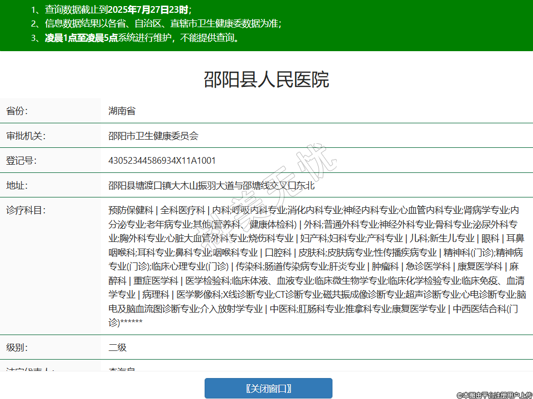 省份:湖南省审批机关:邵阳市卫生健康委员会登记号:43052344586934X11A1001地址:邵阳县塘渡口镇大木山振羽大道与邵塘线交叉口东北诊疗科目:预防保健科 | 全科医疗科 | 内科;呼吸内科专业;消化内科专业;神经内科专业;心血管内科专业;肾病学专业;内分泌专业;老年病专业;其他(营养科、健康体检科) | 外科;普通外科专业;神经外科专业;骨科专业;泌尿外科专业;胸外科专业;心脏大血管外科专业;烧伤科专业 | 妇产科;妇科专业;产科专业 | 儿科;新生儿专业 | 眼科 | 耳鼻咽喉科;耳科专业;鼻科专业;咽喉科专业 | 口腔科 | 皮肤科;皮肤病专业;性传播疾病专业 | 精神科(门诊);精神病专业(门诊);临床心理专业(门诊) | 传染科;肠道传染病专业;肝炎专业 | 肿瘤科 | 急诊医学科 | 康复医学科 | 麻醉科 | 重症医学科 | 医学检验科;临床体液、血液专业;临床微生物学专业;临床化学检验专业;临床免疫、血清学专业 | 病理科 | 医学影像科;X线诊断专业;CT诊断专业;磁共振成像诊断专业;超声诊断专业;心电诊断专业;脑电及脑血流图诊断专业;介入放射学专业 | 中医科;肛肠科专业;推拿科专业;康复医学专业 | 中西医结合科(门诊)******级别:二级法定代表人:李海泉主要负责人:李海泉执业许可证有效期:2025/04/03 -至- 2028/04/11 -
