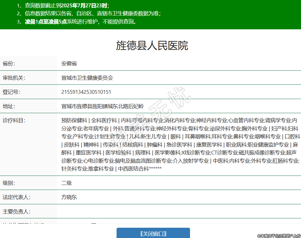 省份:安徽省审批机关:宣城市卫生健康委员会登记号:215591342530510151地址:宣城市旌德县旌阳镇城东北路后妃岭诊疗科目:预防保健科 | 全科医疗科 | 内科;呼吸内科专业;消化内科专业;神经内科专业;心血管内科专业;肾病学专业;内分泌专业;老年病专业 | 外科;普通外科专业;神经外科专业;骨科专业;泌尿外科专业;胸外科专业 | 妇产科;妇科专业;产科专业;计划生育专业 | 儿科;新生儿专业 | 眼科 | 耳鼻咽喉科;耳科专业;鼻科专业;咽喉科专业 | 口腔科 | 皮肤科 | 精神科 | 传染科 | 结核病科 | 肿瘤科 | 急诊医学科 | 康复医学科 | 职业病科;职业健康监护专业 | 麻醉科 | 重症医学科 | 医学检验科 | 病理科 | 医学影像科;X线诊断专业;CT诊断专业;磁共振成像诊断专业;超声诊断专业;心电诊断专业;脑电及脑血流图诊断专业;介入放射学专业 | 中医科;内科专业;外科专业;肛肠科专业;针灸科专业;推拿科专业 | 中西医结合科******级别:二级法定代表人:方晓东主要负责人:执业许可证有效期:2025/04/10 -至- 2026/01/11 -