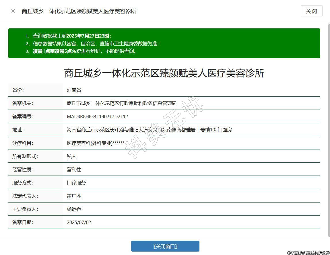 商丘臻颜赋美人医疗美容诊所成立于2023年,坐落于河南省商丘市示范区长江路与睢阳大道交叉口东南角商都雅居10号楼102门面房,以“理性塑美”为理念,采用模块化功能分区设计,涵盖咨询评估、治疗操作及术后休养区域,团队严格执行执业医师资质审核制度,开展皮肤年轻化管理、五官精雕及形体定制等项目。