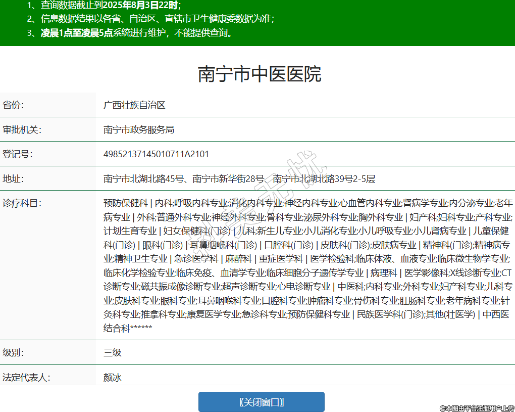 省份:广西壮族自治区审批机关:南宁市政务服务局登记号:49852137145010711A2101地址:南宁市北湖北路45号、南宁市新华街28号、南宁市北湖北路39号2-5层诊疗科目:预防保健科 | 内科;呼吸内科专业;消化内科专业;神经内科专业;心血管内科专业;肾病学专业;内分泌专业;老年病专业 | 外科;普通外科专业;神经外科专业;骨科专业;泌尿外科专业;胸外科专业 | 妇产科;妇科专业;产科专业;计划生育专业 | 妇女保健科(门诊) | 儿科;新生儿专业;小儿消化专业;小儿呼吸专业;小儿肾病专业 | 儿童保健科(门诊) | 眼科(门诊) | 耳鼻咽喉科(门诊) | 口腔科(门诊) | 皮肤科(门诊);皮肤病专业 | 精神科(门诊);精神病专业;精神卫生专业 | 急诊医学科 | 麻醉科 | 重症医学科 | 医学检验科;临床体液、血液专业;临床微生物学专业;临床化学检验专业;临床免疫、血清学专业;临床细胞分子遗传学专业 | 病理科 | 医学影像科;X线诊断专业;CT诊断专业;磁共振成像诊断专业;超声诊断专业;心电诊断专业 | 中医科;内科专业;外科专业;妇产科专业;儿科专业;皮肤科专业;眼科专业;耳鼻咽喉科专业;口腔科专业;肿瘤科专业;骨伤科专业;肛肠科专业;老年病科专业;针灸科专业;推拿科专业;康复医学专业;急诊科专业;预防保健科专业 | 民族医学科(门诊);其他(壮医学) | 中西医结合科******级别:三级法定代表人:颜冰主要负责人:颜冰执业许可证有效期:2025/07/16 -至- 2032/01/27 -
