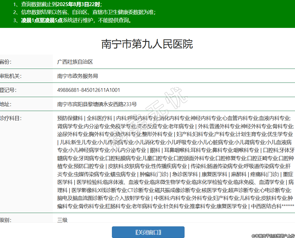 省份:广西壮族自治区审批机关:南宁市政务服务局登记号:49886881-845012611A1001地址:南宁市宾阳县黎塘镇永安西路233号诊疗科目:预防保健科 | 全科医疗科 | 内科;呼吸内科专业;消化内科专业;神经内科专业;心血管内科专业;血液内科专业;肾病学专业;内分泌专业;免疫学专业;变态反应专业;老年病专业 | 外科;普通外科专业;神经外科专业;骨科专业;泌尿外科专业;胸外科专业;烧伤科专业;整形外科专业 | 妇产科;妇科专业;产科专业;计划生育专业;优生学专业 | 儿科;新生儿专业;小儿传染病专业;小儿消化专业;小儿呼吸专业;小儿心脏病专业;小儿肾病专业;小儿血液病专业;小儿神经病学专业;小儿内分泌专业 | 眼科 | 耳鼻咽喉科;耳科专业;鼻科专业;咽喉科专业 | 口腔科;牙体牙髓病专业;牙周病专业;口腔粘膜病专业;儿童口腔专业;口腔颌面外科专业;口腔修复专业;口腔正畸专业;口腔种植专业;预防口腔专业 | 皮肤科;皮肤病专业;性传播疾病专业 | 传染科;肠道传染病专业;呼吸道传染病专业;肝炎专业;虫媒传染病专业;蠕虫病专业 | 肿瘤科(门诊) | 急诊医学科 | 康复医学科 | 麻醉科 | 疼痛科(门诊) | 重症医学科 | 医学检验科;临床体液、血液专业;临床微生物学专业;临床化学检验专业;临床免疫、血清学专业 | 病理科 | 医学影像科;X线诊断专业;CT诊断专业;磁共振成像诊断专业;核医学专业;超声诊断专业;心电诊断专业;脑电及脑血流图诊断专业;介入放射学专业 | 中医科;内科专业;外科专业;妇产科专业;儿科专业;皮肤科专业;肿瘤科专业;骨伤科专业;肛肠科专业;老年病科专业;针灸科专业;推拿科专业;康复医学专业 | 中西医结合科******级别:三级法定代表人:马兴才主要负责人:马兴才执业许可证有效期:2025/07/16 -至- 2038/11/19 -