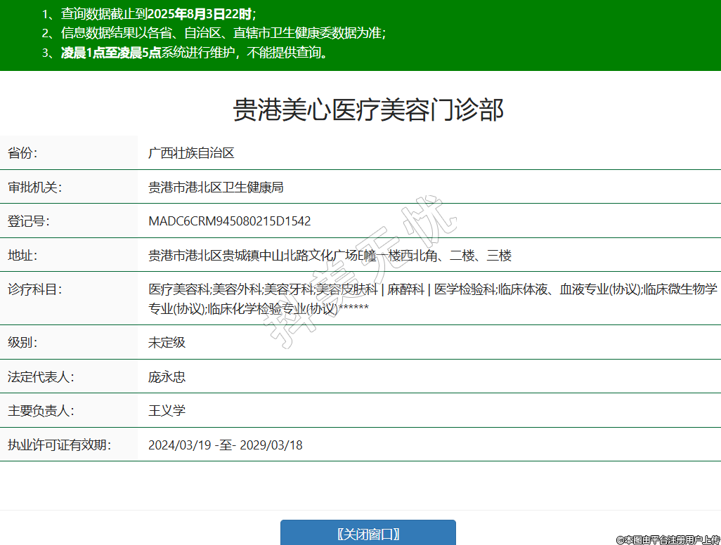 省份:广西壮族自治区审批机关:贵港市港北区卫生健康局登记号:MADC6CRM945080215D1542地址:贵港市港北区贵城镇中山北路文化广场E幢一楼西北角、二楼、三楼诊疗科目:医疗美容科;美容外科;美容牙科;美容皮肤科 | 麻醉科 | 医学检验科;临床体液、血液专业(协议);临床微生物学专业(协议);临床化学检验专业(协议)******级别:未定级法定代表人:庞永忠主要负责人:王义学执业许可证有效期:2024/03/19 -至- 2029/03/18 -