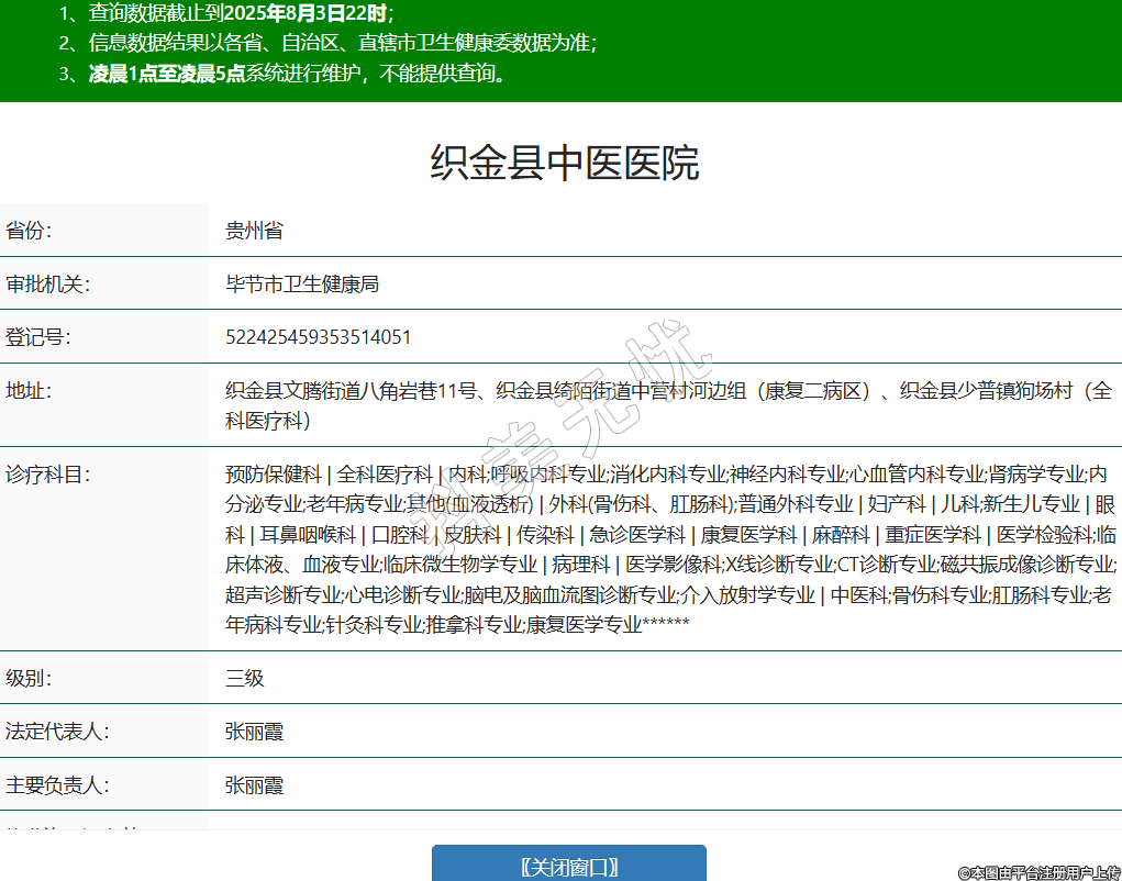 省份:贵州省审批机关:毕节市卫生健康局登记号:522425459353514051地址:织金县文腾街道八角岩巷11号、织金县绮陌街道中营村河边组(康复二病区)、织金县少普镇狗场村(全科医疗科)诊疗科目:预防保健科 | 全科医疗科 | 内科;呼吸内科专业;消化内科专业;神经内科专业;心血管内科专业;肾病学专业;内分泌专业;老年病专业;其他(血液透析) | 外科(骨伤科、肛肠科);普通外科专业 | 妇产科 | 儿科;新生儿专业 | 眼科 | 耳鼻咽喉科 | 口腔科 | 皮肤科 | 传染科 | 急诊医学科 | 康复医学科 | 麻醉科 | 重症医学科 | 医学检验科;临床体液、血液专业;临床微生物学专业 | 病理科 | 医学影像科;X线诊断专业;CT诊断专业;磁共振成像诊断专业;超声诊断专业;心电诊断专业;脑电及脑血流图诊断专业;介入放射学专业 | 中医科;骨伤科专业;肛肠科专业;老年病科专业;针灸科专业;推拿科专业;康复医学专业******级别:三级法定代表人:张丽霞主要负责人:张丽霞执业许可证有效期:2016/06/21 -至- 2030/10/28 -