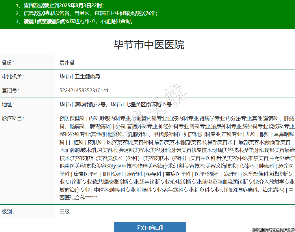 省份:贵州省审批机关:毕节市卫生健康局登记号:522421458352310141地址:毕节市清毕南路32号、毕节市七星关区南环路55号诊疗科目:预防保健科 | 内科;呼吸内科专业;心血管内科专业;血液内科专业;肾病学专业;内分泌专业;其他(营养科、肝病科、脑病科、脾胃病科) | 外科;普通外科专业;神经外科专业;骨科专业;泌尿外科专业;胸外科专业;烧伤科专业;整形外科专业;其他(肝胆外科、乳腺外科、甲状腺外科) | 妇产科;妇科专业;产科专业 | 儿科 | 眼科 | 耳鼻咽喉科 | 口腔科 | 皮肤科 | 医疗美容科;美容外科;眉部美容术;眼部美容术;鼻部美容术;口唇部美容术;颌面部美容术;面部除皱术;乳房美容术;会阴部美容术;美容牙科;牙齿美容修复技术;牙周美容技术操作;牙颌畸形美容矫治技术;美容皮肤科;美容皮肤术(外科);美容皮肤术(内科);美容中医科;针灸美容;中医推拿美容;中药外治;其他中医美容技术;美容医疗应用技术;物理美容治疗术;注射美容技术;美容文饰技术 | 传染科 | 肿瘤科 | 急诊医学科 | 康复医学科 | 职业病科 | 麻醉科 | 疼痛科 | 重症医学科 | 医学检验科 | 病理科 | 医学影像科;X线诊断专业;CT诊断专业;磁共振成像诊断专业;超声诊断专业;心电诊断专业;脑电及脑血流图诊断专业;介入放射学专业;放射治疗专业 | 中医科;肿瘤科专业;肛肠科专业;老年病科专业;针灸科专业;其他(风湿疼痛科、治未病科) | 中西医结合科******级别:三级法定代表人:杨天明主要负责人:杨天明执业许可证有效期:2016/01/30 -至- 2031/01/30 -