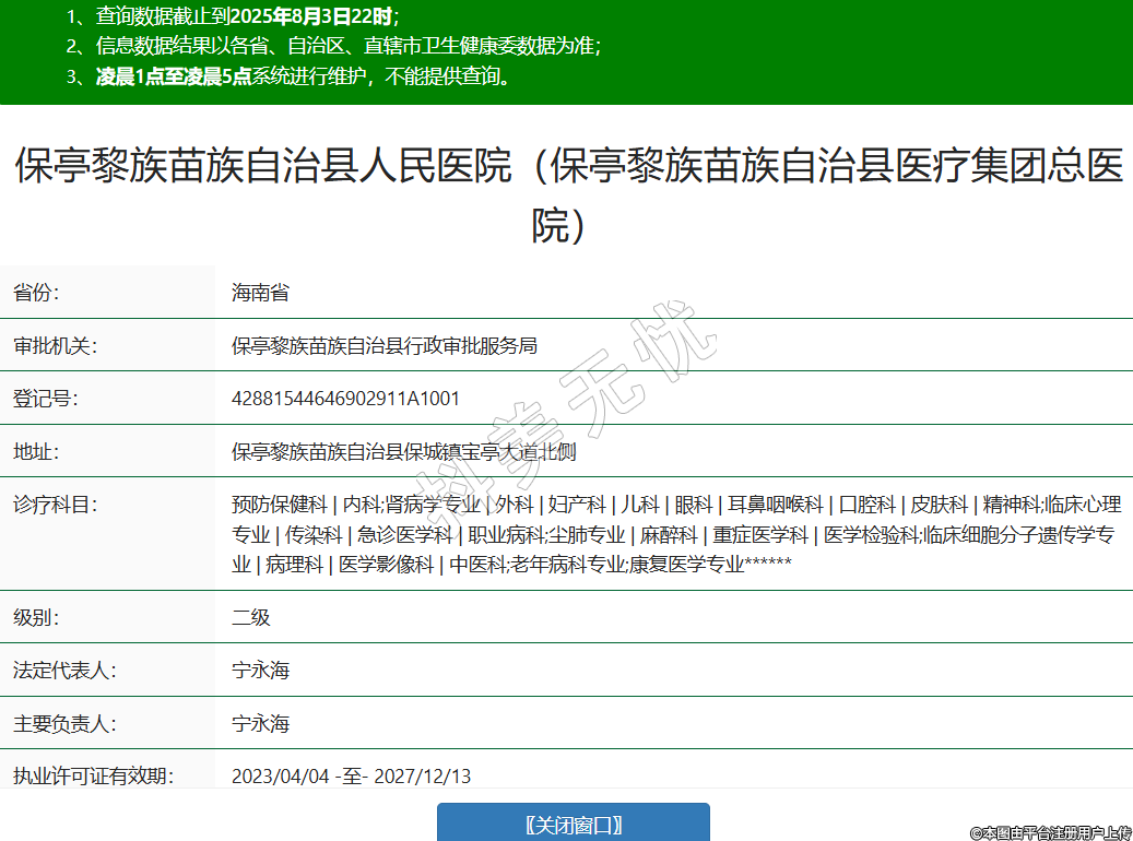 省份:海南省审批机关:保亭黎族苗族自治县行政审批服务局登记号:42881544646902911A1001地址:保亭黎族苗族自治县保城镇宝亭大道北侧诊疗科目:预防保健科 | 内科;肾病学专业 | 外科 | 妇产科 | 儿科 | 眼科 | 耳鼻咽喉科 | 口腔科 | 皮肤科 | 精神科;临床心理专业 | 传染科 | 急诊医学科 | 职业病科;尘肺专业 | 麻醉科 | 重症医学科 | 医学检验科;临床细胞分子遗传学专业 | 病理科 | 医学影像科 | 中医科;老年病科专业;康复医学专业******级别:二级法定代表人:宁永海主要负责人:宁永海执业许可证有效期:2023/04/04 -至- 2027/12/13 -
