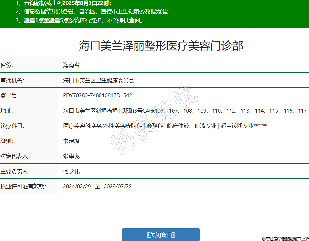 省份:海南省审批机关:海口市美兰区卫生健康委员会登记号:PDY70380-746010817D1542地址:海口市美兰区新埠岛埠北环路3号C4栋106、107、108、109、110、112、113、114、115、116、117诊疗科目:医疗美容科;美容外科;美容皮肤科 | 麻醉科 | 临床体液、血液专业 | 超声诊断专业******级别:未定级法定代表人:张津珑主要负责人:何学礼执业许可证有效期:2024/02/29 -至- 2029/02/28 -