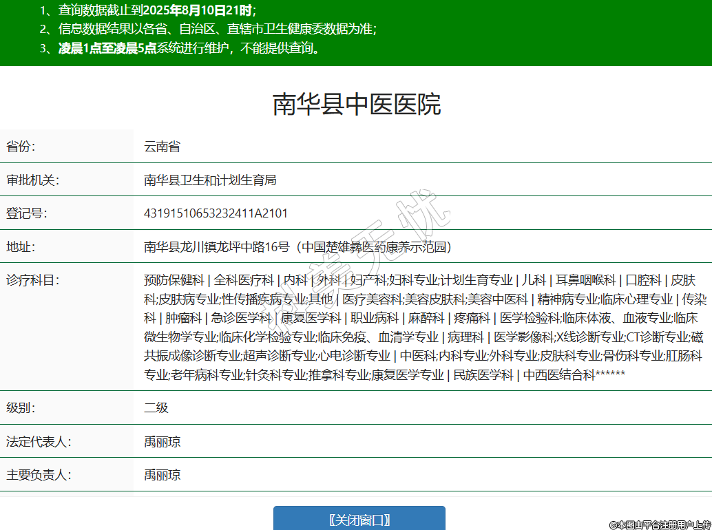 省份:云南省审批机关:南华县卫生和计划生育局登记号:43191510653232411A2101地址:南华县龙川镇龙坪中路16号(中国楚雄彝医药康养示范园)诊疗科目:预防保健科 | 全科医疗科 | 内科 | 外科 | 妇产科;妇科专业;计划生育专业 | 儿科 | 耳鼻咽喉科 | 口腔科 | 皮肤科;皮肤病专业;性传播疾病专业;其他 | 医疗美容科;美容皮肤科;美容中医科 | 精神病专业;临床心理专业 | 传染科 | 肿瘤科 | 急诊医学科 | 康复医学科 | 职业病科 | 麻醉科 | 疼痛科 | 医学检验科;临床体液、血液专业;临床微生物学专业;临床化学检验专业;临床免疫、血清学专业 | 病理科 | 医学影像科;X线诊断专业;CT诊断专业;磁共振成像诊断专业;超声诊断专业;心电诊断专业 | 中医科;内科专业;外科专业;皮肤科专业;骨伤科专业;肛肠科专业;老年病科专业;针灸科专业;推拿科专业;康复医学专业 | 民族医学科 | 中西医结合科******级别:二级法定代表人:禹丽琼主要负责人:禹丽琼执业许可证有效期:2025/04/16 -至- 2037/12/30 -