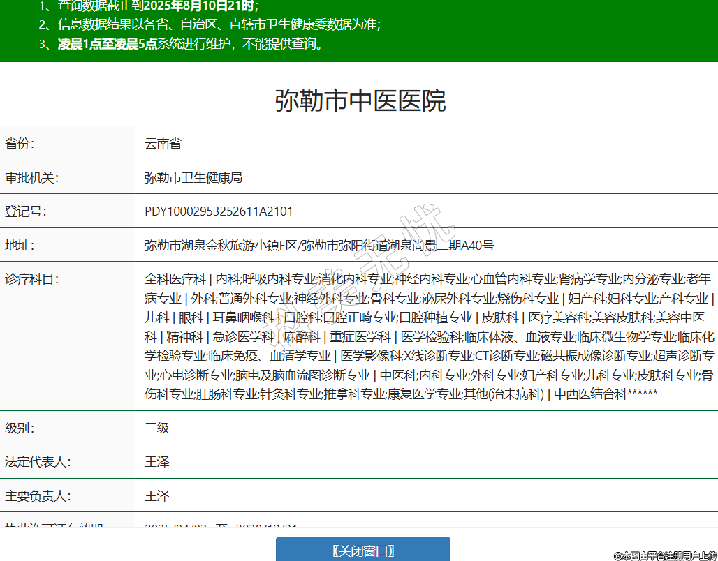 省份:云南省审批机关:弥勒市卫生健康局登记号:PDY10002953252611A2101地址:弥勒市湖泉金秋旅游小镇F区/弥勒市弥阳街道湖泉尚景二期A40号诊疗科目:全科医疗科 | 内科;呼吸内科专业;消化内科专业;神经内科专业;心血管内科专业;肾病学专业;内分泌专业;老年病专业 | 外科;普通外科专业;神经外科专业;骨科专业;泌尿外科专业;烧伤科专业 | 妇产科;妇科专业;产科专业 | 儿科 | 眼科 | 耳鼻咽喉科 | 口腔科;口腔正畸专业;口腔种植专业 | 皮肤科 | 医疗美容科;美容皮肤科;美容中医科 | 精神科 | 急诊医学科 | 麻醉科 | 重症医学科 | 医学检验科;临床体液、血液专业;临床微生物学专业;临床化学检验专业;临床免疫、血清学专业 | 医学影像科;X线诊断专业;CT诊断专业;磁共振成像诊断专业;超声诊断专业;心电诊断专业;脑电及脑血流图诊断专业 | 中医科;内科专业;外科专业;妇产科专业;儿科专业;皮肤科专业;骨伤科专业;肛肠科专业;针灸科专业;推拿科专业;康复医学专业;其他(治未病科) | 中西医结合科******级别:三级法定代表人:王泽主要负责人:王泽执业许可证有效期:2025/04/03 -至- 2038/12/21 -