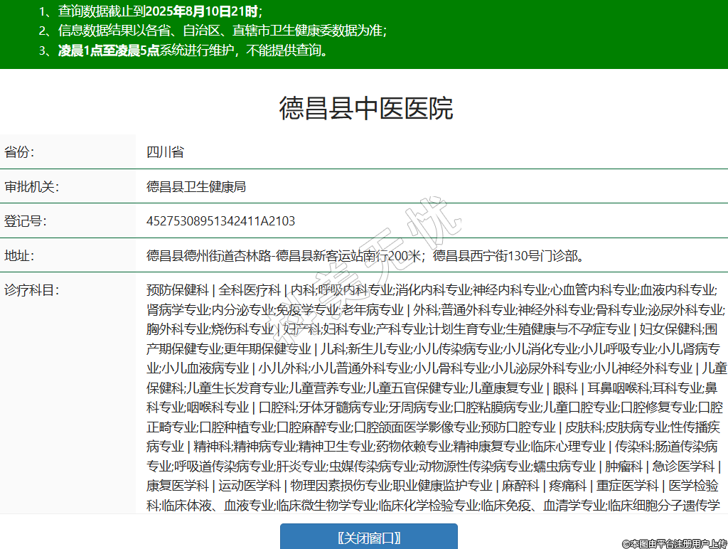 省份:四川省审批机关:德昌县卫生健康局登记号:45275308951342411A2103地址:德昌县德州街道杏林路-德昌县新客运站南行200米;德昌县西宁街130号门诊部。诊疗科目:预防保健科 | 全科医疗科 | 内科;呼吸内科专业;消化内科专业;神经内科专业;心血管内科专业;血液内科专业;肾病学专业;内分泌专业;免疫学专业;老年病专业 | 外科;普通外科专业;神经外科专业;骨科专业;泌尿外科专业;胸外科专业;烧伤科专业 | 妇产科;妇科专业;产科专业;计划生育专业;生殖健康与不孕症专业 | 妇女保健科;围产期保健专业;更年期保健专业 | 儿科;新生儿专业;小儿传染病专业;小儿消化专业;小儿呼吸专业;小儿肾病专业;小儿血液病专业 | 小儿外科;小儿普通外科专业;小儿骨科专业;小儿泌尿外科专业;小儿神经外科专业 | 儿童保健科;儿童生长发育专业;儿童营养专业;儿童五官保健专业;儿童康复专业 | 眼科 | 耳鼻咽喉科;耳科专业;鼻科专业;咽喉科专业 | 口腔科;牙体牙髓病专业;牙周病专业;口腔粘膜病专业;儿童口腔专业;口腔修复专业;口腔正畸专业;口腔种植专业;口腔麻醉专业;口腔颌面医学影像专业;预防口腔专业 | 皮肤科;皮肤病专业;性传播疾病专业 | 精神科;精神病专业;精神卫生专业;药物依赖专业;精神康复专业;临床心理专业 | 传染科;肠道传染病专业;呼吸道传染病专业;肝炎专业;虫媒传染病专业;动物源性传染病专业;蠕虫病专业 | 肿瘤科 | 急诊医学科 | 康复医学科 | 运动医学科 | 物理因素损伤专业;职业健康监护专业 | 麻醉科 | 疼痛科 | 重症医学科 | 医学检验科;临床体液、血液专业;临床微生物学专业;临床化学检验专业;临床免疫、血清学专业;临床细胞分子遗传学专业 | 病理科 | 医学影像科;X线诊断专业;CT诊断专业;磁共振成像诊断专业;超声诊断专业;心电诊断专业;脑电及脑血流图诊断专业;介入放射学专业 | 中医科;内科专业;外科专业;妇产科专业;儿科专业;皮肤科专业;眼科专业;耳鼻咽喉科专业;口腔科专业;肿瘤科专业;骨伤科专业;肛肠科专业;老年病科专业;针灸科专业;推拿科专业;康复医学专业;急诊科专业;预防保健科专业 | 中西医结合科******级别:三级法定代表人:何祥飞主要负责人:何祥飞执业许可证有效期:2024/09/03 -至- 2025/12/30 -