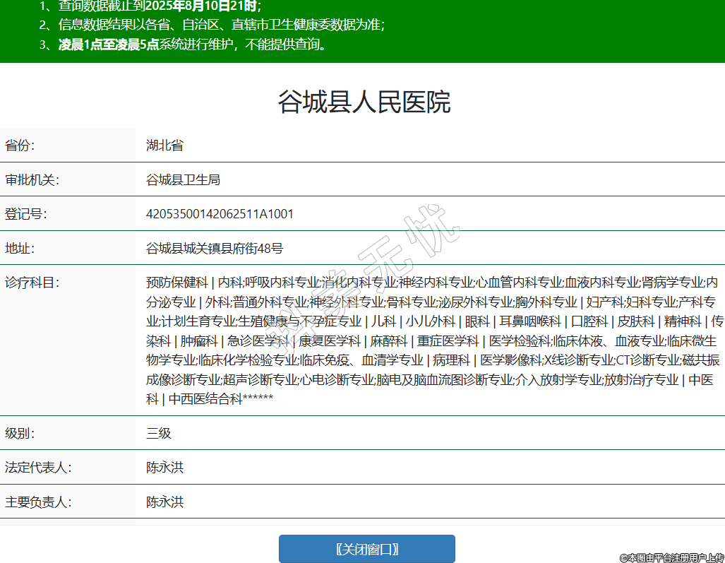 省份:湖北省审批机关:谷城县卫生局登记号:42053500142062511A1001地址:谷城县城关镇县府街48号诊疗科目:预防保健科 | 内科;呼吸内科专业;消化内科专业;神经内科专业;心血管内科专业;血液内科专业;肾病学专业;内分泌专业 | 外科;普通外科专业;神经外科专业;骨科专业;泌尿外科专业;胸外科专业 | 妇产科;妇科专业;产科专业;计划生育专业;生殖健康与不孕症专业 | 儿科 | 小儿外科 | 眼科 | 耳鼻咽喉科 | 口腔科 | 皮肤科 | 精神科 | 传染科 | 肿瘤科 | 急诊医学科 | 康复医学科 | 麻醉科 | 重症医学科 | 医学检验科;临床体液、血液专业;临床微生物学专业;临床化学检验专业;临床免疫、血清学专业 | 病理科 | 医学影像科;X线诊断专业;CT诊断专业;磁共振成像诊断专业;超声诊断专业;心电诊断专业;脑电及脑血流图诊断专业;介入放射学专业;放射治疗专业 | 中医科 | 中西医结合科******级别:三级法定代表人:陈永洪主要负责人:陈永洪执业许可证有效期:2008/10/15 -至- 2023/10/14 -