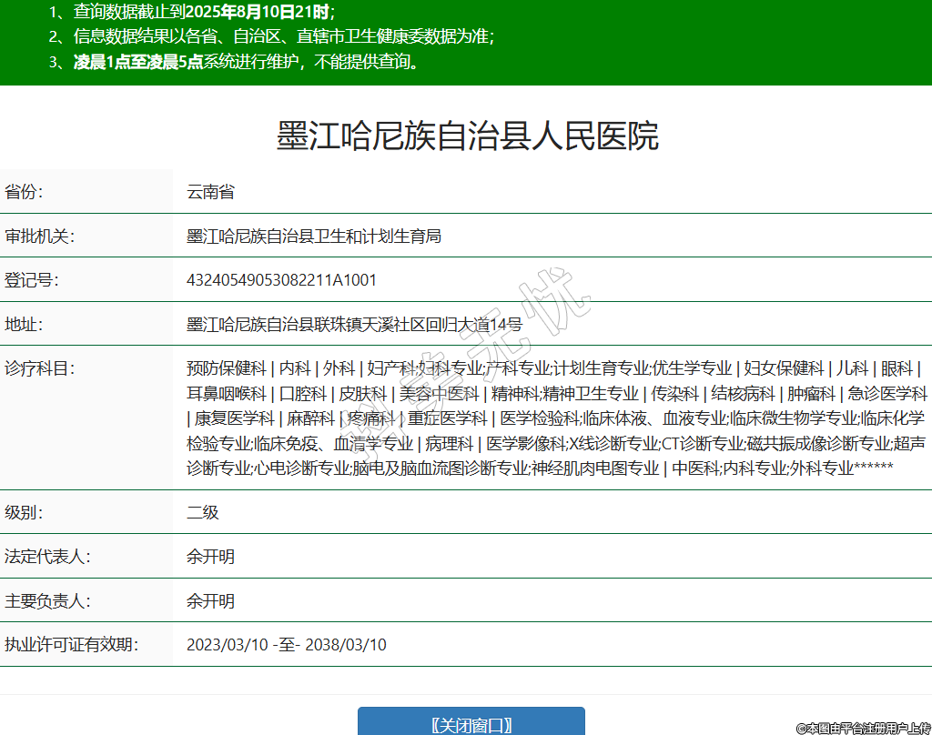 省份:云南省审批机关:墨江哈尼族自治县卫生和计划生育局登记号:43240549053082211A1001地址:墨江哈尼族自治县联珠镇天溪社区回归大道14号诊疗科目:预防保健科 | 内科 | 外科 | 妇产科;妇科专业;产科专业;计划生育专业;优生学专业 | 妇女保健科 | 儿科 | 眼科 | 耳鼻咽喉科 | 口腔科 | 皮肤科 | 美容中医科 | 精神科;精神卫生专业 | 传染科 | 结核病科 | 肿瘤科 | 急诊医学科 | 康复医学科 | 麻醉科 | 疼痛科 | 重症医学科 | 医学检验科;临床体液、血液专业;临床微生物学专业;临床化学检验专业;临床免疫、血清学专业 | 病理科 | 医学影像科;X线诊断专业;CT诊断专业;磁共振成像诊断专业;超声诊断专业;心电诊断专业;脑电及脑血流图诊断专业;神经肌肉电图专业 | 中医科;内科专业;外科专业******级别:二级法定代表人:余开明主要负责人:余开明执业许可证有效期:2023/03/10 -至- 2038/03/10 -