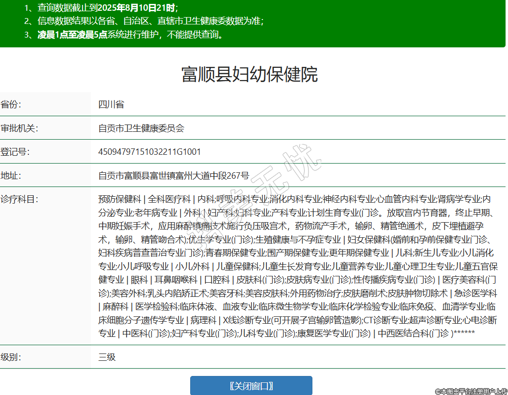 省份:四川省审批机关:自贡市卫生健康委员会登记号:45094797151032211G1001地址:自贡市富顺县富世镇富州大道中段267号诊疗科目:预防保健科 | 全科医疗科 | 内科;呼吸内科专业;消化内科专业;神经内科专业;心血管内科专业;肾病学专业;内分泌专业;老年病专业 | 外科 | 妇产科;妇科专业;产科专业;计划生育专业(门诊。放取宫内节育器,终止早期、中期妊娠手术,应用麻醉镇痛技术施行负压吸宫术,药物流产手术,输卵、精管绝通术,皮下埋植避孕术,输卵、精管吻合术);优生学专业(门诊);生殖健康与不孕症专业 | 妇女保健科(婚前和孕前保健专业门诊、妇科疾病普查普治专业门诊);青春期保健专业;围产期保健专业;更年期保健专业 | 儿科;新生儿专业;小儿消化专业;小儿呼吸专业 | 小儿外科 | 儿童保健科;儿童生长发育专业;儿童营养专业;儿童心理卫生专业;儿童五官保健专业 | 眼科 | 耳鼻咽喉科 | 口腔科 | 皮肤科(门诊);皮肤病专业(门诊);性传播疾病专业(门诊) | 医疗美容科(门诊);美容外科;乳头内陷矫正术;美容牙科;美容皮肤科;外用药物治疗;皮肤磨削术;皮肤肿物切除术 | 急诊医学科 | 麻醉科 | 医学检验科;临床体液、血液专业;临床微生物学专业;临床化学检验专业;临床免疫、血清学专业;临床细胞分子遗传学专业 | 病理科 | X线诊断专业(可开展子宫输卵管造影);CT诊断专业;超声诊断专业;心电诊断专业 | 中医科(门诊);妇产科专业(门诊);儿科专业(门诊);康复医学专业(门诊) | 中西医结合科(门诊 )******级别:三级法定代表人:黄文平主要负责人:黄文平执业许可证有效期:2017/07/24 -至- 2032/07/23 -