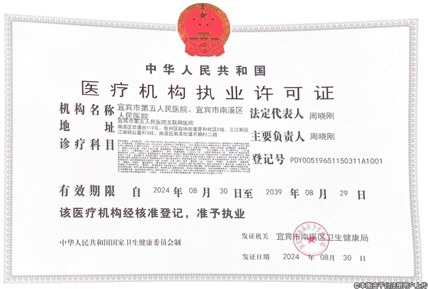 省份:四川省审批机关:宜宾市南溪区卫生健康局登记号:PDY00519651150311A1001地址:南溪区交通街113号、三江新区江南镇红星村3社、南溪区南溪街道石鹅村二组诊疗科目:预防保健科 | 全科医疗科 | 内科;呼吸内科专业;消化内科专业;神经内科专业;心血管内科专业;血液内科专业;肾病学专业(同意开展血液透析,血液透析室,血液透析机28台);内分泌专业;免疫学专业;老年病专业 | 外科;普通外科专业;神经外科专业;骨科专业;泌尿外科专业;胸外科专业;烧伤科专业;整形外科专业 | 妇产科;妇科专业;产科专业;计划生育专业(放置宫内节育器,取宫内节育器,输卵管接扎,输精管接扎,早期人工终止妊娠,中期人工终止妊娠,输精管复通,输卵管复通,皮下埋置节育器。) | 妇女保健科(门诊);妇女营养专业 | 儿科(普儿、新生儿) | 儿童保健科(门诊);儿童营养专业 | 眼科 | 耳鼻咽喉科 | 口腔科(门诊) | 皮肤科(美容皮肤门诊) | 医疗美容科(门诊);美容外科(门诊);眉提升术;重睑术;下睑袋矫正术;上睑下垂矫正术;隆鼻术;鼻小柱及鼻孔美容术;歪鼻矫正术;招风耳矫正术;重唇美容术;唇珠美容术;口角成形术;颞部填充术;颏成形术;面部除皱术;额颞部除皱术;负压脂肪抽吸术;电子吸脂术;会阴部美容术;阴道松弛缩紧术;小阴唇肥大缩小术;美容皮肤科;美容皮肤术(外科);诊断技术;真菌镜检技术;皮肤活检术;治疗技术;糖皮质激素皮损内注射;药物加压治疗;外用药物治疗;光化学疗法;美容皮肤术(内科);皮肤磨削术;酒渣鼻切割术;皮肤肿物切除术;拔甲术;刮除术;自体表皮移植术;腋臭手术;足病修治术;毛发移植术;医疗美容心理诊断及辅导;美容医疗应用技术;物理美容治疗术;激光美容治疗术;高频电美容治疗;冷冻美容治疗;其他物理美容治疗;脱毛术;穿耳孔术;注射美容技术;A型肉毒毒素美容注射技术;皮肤(软组织)注射(填充)美容 | 精神科(门诊) | 传染科 | 肿瘤科 | 急诊医学科 | 康复医学科 | 临终关怀科 | 麻醉科 | 疼痛科 | 重症医学科 | 医学检验科;临床体液、血液专业;临床微生物学专业;临床化学检验专业;临床免疫、血清学专业;临床细胞分子遗传学专业 | 病理科 | 医学影像科;X线诊断专业(口腔颌面锥形束计算机摄影、移动式摄影X线机、X射线计算机体层摄影设备、医用X射线诊断、数字化医用X射线摄影系统、高频移动式C型臂X射线机、移动式C型臂X射线机、双能X射线骨密度仪);CT诊断专业(X射线计算机体层摄影设备);磁共振成像诊断专业;超声诊断专业;心电诊断专业;脑电及脑血流图诊断专业;神经肌肉电图专业;介入放射学专业(DSA全数字化通用型平板血管造影系统) | 中医科 | 中西医结合科(同意开展健康体检,其他审批项目详见副本)******级别:三级法定代表人:周晓刚主要负责人:周晓刚执业许可证有效期:2024/12/24 -至- 2039/12/24 -