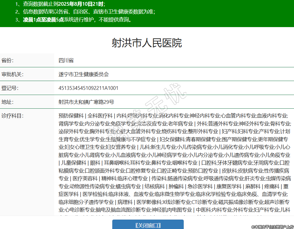 省份:四川省审批机关:遂宁市卫生健康委员会登记号:45135345451092211A1001地址:射洪市太和镇广寒路29号诊疗科目:预防保健科 | 全科医疗科 | 内科;呼吸内科专业;消化内科专业;神经内科专业;心血管内科专业;血液内科专业;肾病学专业;内分泌专业;免疫学专业;变态反应专业;老年病专业 | 外科;普通外科专业;神经外科专业;骨科专业;泌尿外科专业;胸外科专业;心脏大血管外科专业;烧伤科专业;整形外科专业 | 妇产科;妇科专业;产科专业;计划生育专业;优生学专业;生殖健康与不孕症专业 | 妇女保健科;青春期保健专业;围产期保健专业;更年期保健专业;妇女心理卫生专业;妇女营养专业 | 儿科;新生儿专业;小儿传染病专业;小儿消化专业;小儿呼吸专业;小儿心脏病专业;小儿肾病专业;小儿血液病专业;小儿神经病学专业;小儿内分泌专业;小儿遗传病专业;小儿免疫专业 | 儿童保健科 | 眼科 | 耳鼻咽喉科;耳科专业;鼻科专业;咽喉科专业 | 口腔科;牙体牙髓病专业;牙周病专业;口腔粘膜病专业;口腔颌面外科专业;口腔修复专业;口腔正畸专业;预防口腔专业 | 皮肤科;皮肤病专业;性传播疾病专业 | 医疗美容科 | 精神科;临床心理专业 | 传染科;肠道传染病专业;呼吸道传染病专业;肝炎专业;虫媒传染病专业;动物源性传染病专业;蠕虫病专业 | 结核病科 | 肿瘤科 | 急诊医学科 | 康复医学科 | 麻醉科 | 疼痛科 | 重症医学科 | 医学检验科;临床体液、血液专业;临床微生物学专业;临床化学检验专业;临床免疫、血清学专业;临床细胞分子遗传学专业 | 病理科 | 医学影像科;X线诊断专业;CT诊断专业;磁共振成像诊断专业;超声诊断专业;心电诊断专业;脑电及脑血流图诊断专业;神经肌肉电图专业 | 中医科;内科专业;外科专业;妇产科专业;儿科专业;骨伤科专业;针灸科专业;推拿科专业;康复医学专业 | 中西医结合科(其他许可信息详见副本)******级别:三级法定代表人:谢莉主要负责人:谢莉执业许可证有效期:2011/01/01 -至- 2025/12/31 -