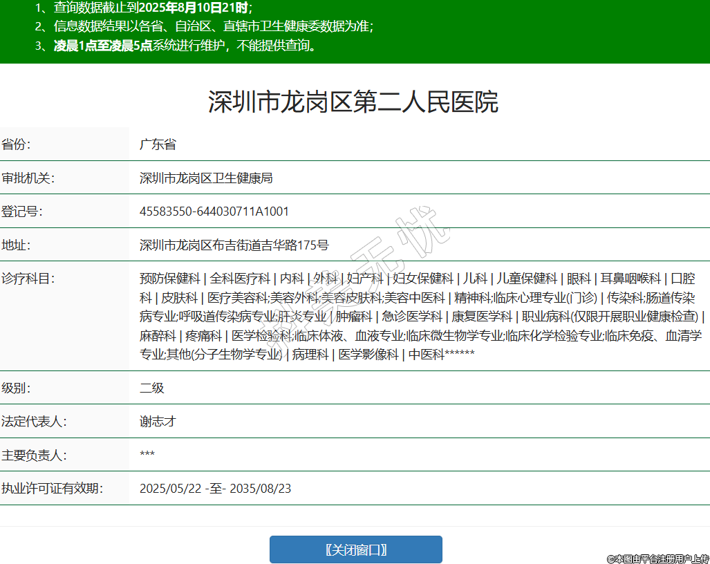 省份:广东省审批机关:深圳市龙岗区卫生健康局登记号:45583550-644030711A1001地址:深圳市龙岗区布吉街道吉华路175号诊疗科目:预防保健科 | 全科医疗科 | 内科 | 外科 | 妇产科 | 妇女保健科 | 儿科 | 儿童保健科 | 眼科 | 耳鼻咽喉科 | 口腔科 | 皮肤科 | 医疗美容科;美容外科;美容皮肤科;美容中医科 | 精神科;临床心理专业(门诊) | 传染科;肠道传染病专业;呼吸道传染病专业;肝炎专业 | 肿瘤科 | 急诊医学科 | 康复医学科 | 职业病科(仅限开展职业健康检查) | 麻醉科 | 疼痛科 | 医学检验科;临床体液、血液专业;临床微生物学专业;临床化学检验专业;临床免疫、血清学专业;其他(分子生物学专业) | 病理科 | 医学影像科 | 中医科******级别:二级法定代表人:谢志才主要负责人:***执业许可证有效期:2025/05/22 -至- 2035/08/23 -