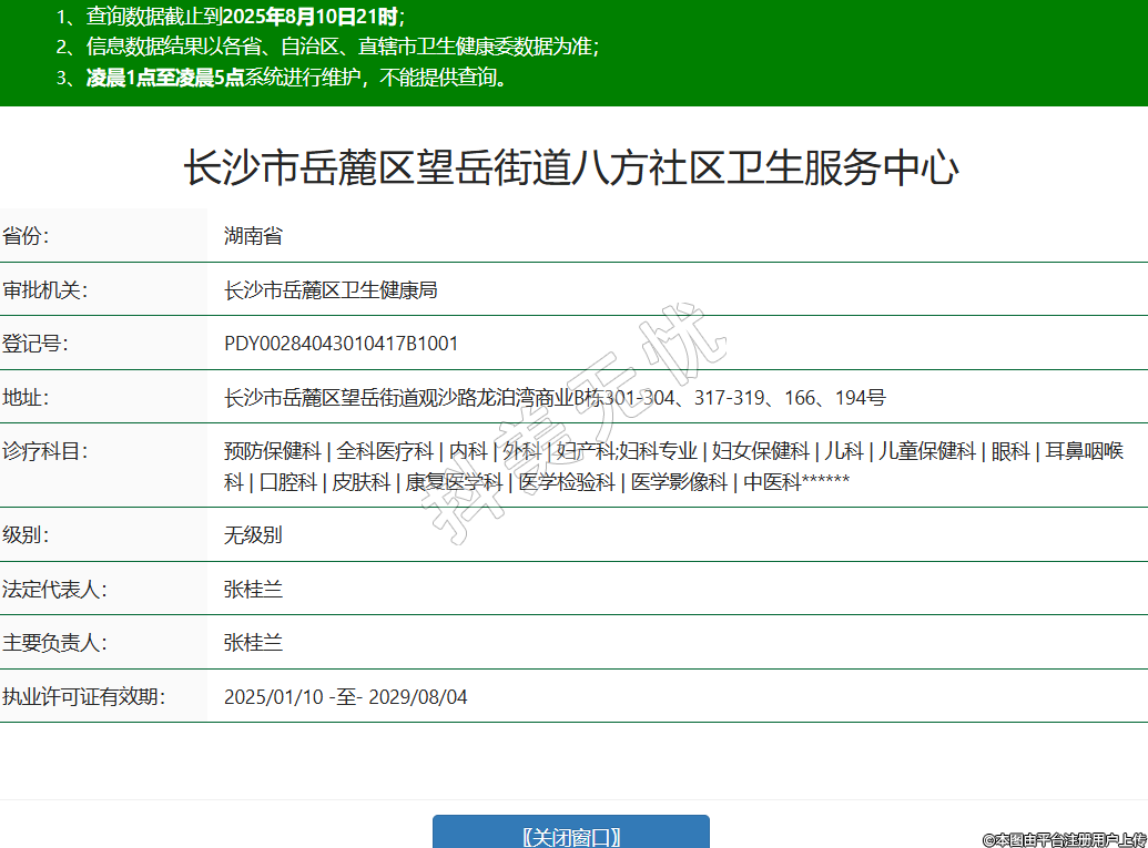 省份:湖南省审批机关:长沙市岳麓区卫生健康局登记号:PDY00284043010417B1001地址:长沙市岳麓区望岳街道观沙路龙泊湾商业B栋301-304、317-319、166、194号诊疗科目:预防保健科 | 全科医疗科 | 内科 | 外科 | 妇产科;妇科专业 | 妇女保健科 | 儿科 | 儿童保健科 | 眼科 | 耳鼻咽喉科 | 口腔科 | 皮肤科 | 康复医学科 | 医学检验科 | 医学影像科 | 中医科******级别:无级别法定代表人:张桂兰主要负责人:张桂兰执业许可证有效期:2025/01/10 -至- 2029/08/04 -