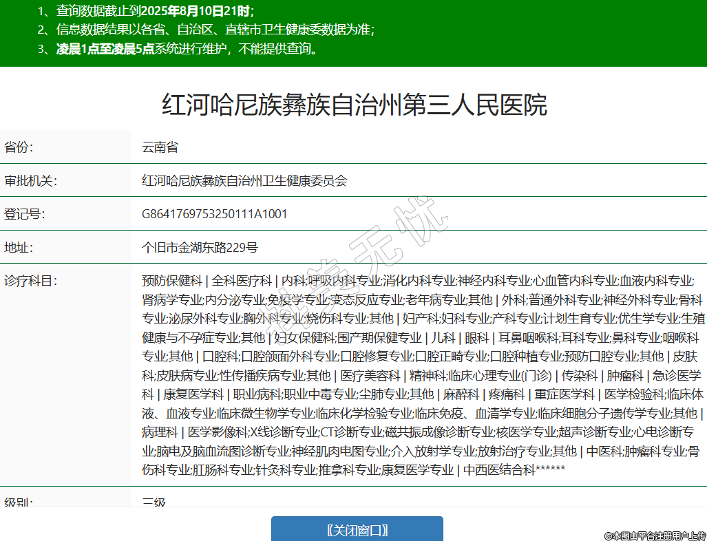 省份:云南省审批机关:红河哈尼族彝族自治州卫生健康委员会登记号:G8641769753250111A1001地址:个旧市金湖东路229号诊疗科目:预防保健科 | 全科医疗科 | 内科;呼吸内科专业;消化内科专业;神经内科专业;心血管内科专业;血液内科专业;肾病学专业;内分泌专业;免疫学专业;变态反应专业;老年病专业;其他 | 外科;普通外科专业;神经外科专业;骨科专业;泌尿外科专业;胸外科专业;烧伤科专业;其他 | 妇产科;妇科专业;产科专业;计划生育专业;优生学专业;生殖健康与不孕症专业;其他 | 妇女保健科;围产期保健专业 | 儿科 | 眼科 | 耳鼻咽喉科;耳科专业;鼻科专业;咽喉科专业;其他 | 口腔科;口腔颌面外科专业;口腔修复专业;口腔正畸专业;口腔种植专业;预防口腔专业;其他 | 皮肤科;皮肤病专业;性传播疾病专业;其他 | 医疗美容科 | 精神科;临床心理专业(门诊) | 传染科 | 肿瘤科 | 急诊医学科 | 康复医学科 | 职业病科;职业中毒专业;尘肺专业;其他 | 麻醉科 | 疼痛科 | 重症医学科 | 医学检验科;临床体液、血液专业;临床微生物学专业;临床化学检验专业;临床免疫、血清学专业;临床细胞分子遗传学专业;其他 | 病理科 | 医学影像科;X线诊断专业;CT诊断专业;磁共振成像诊断专业;核医学专业;超声诊断专业;心电诊断专业;脑电及脑血流图诊断专业;神经肌肉电图专业;介入放射学专业;放射治疗专业;其他 | 中医科;肿瘤科专业;骨伤科专业;肛肠科专业;针灸科专业;推拿科专业;康复医学专业 | 中西医结合科******级别:三级法定代表人:马刚主要负责人:马刚执业许可证有效期:2025/02/10 -至- 2040/02/09 -