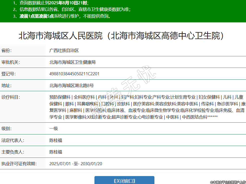 省份:广西壮族自治区审批机关:北海市海城区卫生健康局登记号:49881038445050211C2201地址:北海市海城区湖北路8号诊疗科目:预防保健科 | 全科医疗科 | 内科 | 外科 | 妇产科;妇科专业;产科专业;计划生育专业 | 妇女保健科 | 儿科 | 儿童保健科 | 眼科 | 耳鼻咽喉科 | 口腔科 | 皮肤科 | 医疗美容科;美容皮肤科;美容中医科 | 传染科 | 急诊医学科 | 康复医学科 | 麻醉科 | 医学检验科;临床体液、血液专业;临床微生物学专业;临床化学检验专业;临床免疫、血清学专业 | 医学影像科;X线诊断专业;超声诊断专业;心电诊断专业 | 中医科 | 中西医结合科******级别:一级法定代表人:陈桂福主要负责人:陈桂福执业许可证有效期:2025/07/01 -至- 2030/01/20 -
