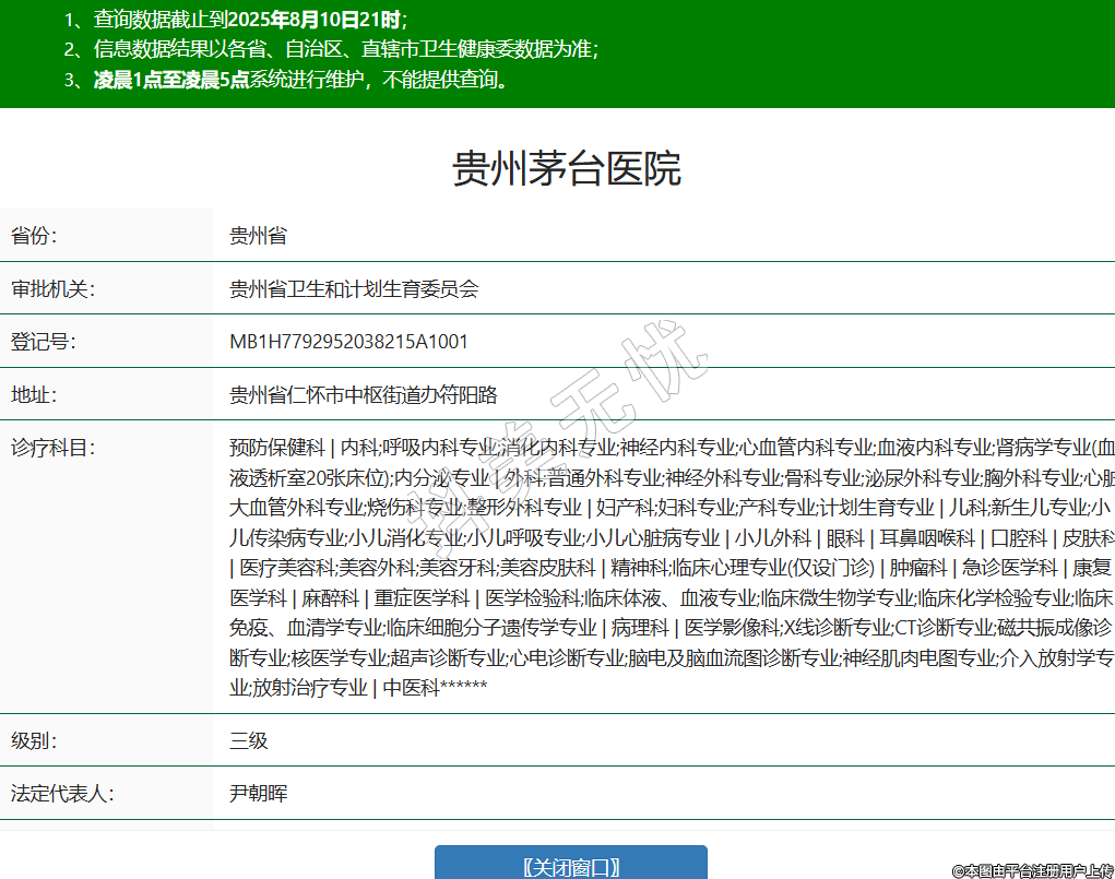 省份:贵州省审批机关:贵州省卫生和计划生育委员会登记号:MB1H7792952038215A1001地址:贵州省仁怀市中枢街道办符阳路诊疗科目:预防保健科 | 内科;呼吸内科专业;消化内科专业;神经内科专业;心血管内科专业;血液内科专业;肾病学专业(血液透析室20张床位);内分泌专业 | 外科;普通外科专业;神经外科专业;骨科专业;泌尿外科专业;胸外科专业;心脏大血管外科专业;烧伤科专业;整形外科专业 | 妇产科;妇科专业;产科专业;计划生育专业 | 儿科;新生儿专业;小儿传染病专业;小儿消化专业;小儿呼吸专业;小儿心脏病专业 | 小儿外科 | 眼科 | 耳鼻咽喉科 | 口腔科 | 皮肤科 | 医疗美容科;美容外科;美容牙科;美容皮肤科 | 精神科;临床心理专业(仅设门诊) | 肿瘤科 | 急诊医学科 | 康复医学科 | 麻醉科 | 重症医学科 | 医学检验科;临床体液、血液专业;临床微生物学专业;临床化学检验专业;临床免疫、血清学专业;临床细胞分子遗传学专业 | 病理科 | 医学影像科;X线诊断专业;CT诊断专业;磁共振成像诊断专业;核医学专业;超声诊断专业;心电诊断专业;脑电及脑血流图诊断专业;神经肌肉电图专业;介入放射学专业;放射治疗专业 | 中医科******级别:三级法定代表人:尹朝晖主要负责人:尹朝晖执业许可证有效期:2025/04/25 -至- 2028/04/25 -