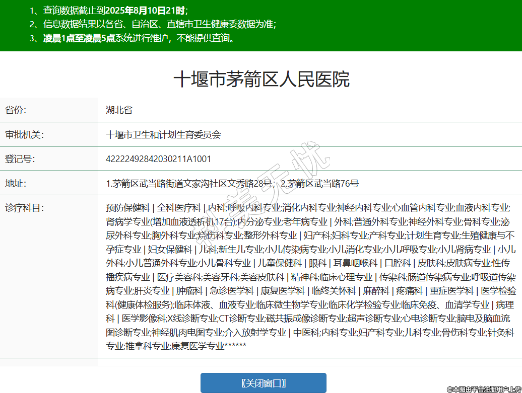 省份:湖北省审批机关:十堰市卫生和计划生育委员会登记号:42222492842030211A1001地址:1.茅箭区武当路街道文家沟社区文秀路28号;2.茅箭区武当路76号诊疗科目:预防保健科 | 全科医疗科 | 内科;呼吸内科专业;消化内科专业;神经内科专业;心血管内科专业;血液内科专业;肾病学专业(增加血液透析机17台);内分泌专业;老年病专业 | 外科;普通外科专业;神经外科专业;骨科专业;泌尿外科专业;胸外科专业;烧伤科专业;整形外科专业 | 妇产科;妇科专业;产科专业;计划生育专业;生殖健康与不孕症专业 | 妇女保健科 | 儿科;新生儿专业;小儿传染病专业;小儿消化专业;小儿呼吸专业;小儿肾病专业 | 小儿外科;小儿普通外科专业;小儿骨科专业 | 儿童保健科 | 眼科 | 耳鼻咽喉科 | 口腔科 | 皮肤科;皮肤病专业;性传播疾病专业 | 医疗美容科;美容牙科;美容皮肤科 | 精神科;临床心理专业 | 传染科;肠道传染病专业;呼吸道传染病专业;肝炎专业 | 肿瘤科 | 急诊医学科 | 康复医学科 | 临终关怀科 | 麻醉科 | 疼痛科 | 重症医学科 | 医学检验科(健康体检服务);临床体液、血液专业;临床微生物学专业;临床化学检验专业;临床免疫、血清学专业 | 病理科 | 医学影像科;X线诊断专业;CT诊断专业;磁共振成像诊断专业;超声诊断专业;心电诊断专业;脑电及脑血流图诊断专业;神经肌肉电图专业;介入放射学专业 | 中医科;内科专业;妇产科专业;儿科专业;骨伤科专业;针灸科专业;推拿科专业;康复医学专业******级别:二级法定代表人:王新辉主要负责人:王新辉执业许可证有效期:2011/11/17 -至- 2026/11/16 -