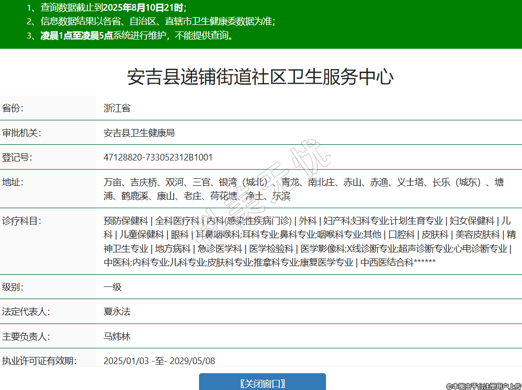 省份:浙江省审批机关:安吉县卫生健康局登记号:47128820-733052312B1001地址:万亩、吉庆桥、双河、三官、银湾(城北)、青龙、南北庄、赤山、赤渔、义士塔、长乐(城东)、塘浦、鹤鹿溪、康山、老庄、荷花塘、净土、东滨诊疗科目:预防保健科 | 全科医疗科 | 内科(感染性疾病门诊) | 外科 | 妇产科;妇科专业;计划生育专业 | 妇女保健科 | 儿科 | 儿童保健科 | 眼科 | 耳鼻咽喉科;耳科专业;鼻科专业;咽喉科专业;其他 | 口腔科 | 皮肤科 | 美容皮肤科 | 精神卫生专业 | 地方病科 | 急诊医学科 | 医学检验科 | 医学影像科;X线诊断专业;超声诊断专业;心电诊断专业 | 中医科;内科专业;儿科专业;皮肤科专业;推拿科专业;康复医学专业 | 中西医结合科******级别:一级法定代表人:夏永法主要负责人:马炜林执业许可证有效期:2025/01/03 -至- 2029/05/08 -