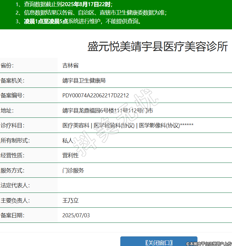 盛元悦美靖宇县医疗美容诊所,诊疗科目:医疗美容科 | 医学检验科(协议) | 医学影像科(协议)******
