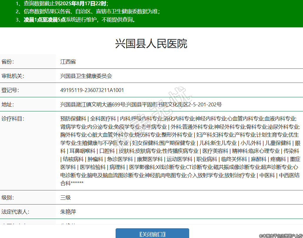 省份:江西省审批机关:兴国县卫生健康委员会登记号:49195119-236073211A1001地址:兴国县潋江镇文明大道699号;兴国县平固街书院文化街区2-5-201-202号诊疗科目:预防保健科 | 全科医疗科 | 内科;呼吸内科专业;消化内科专业;神经内科专业;心血管内科专业;血液内科专业;肾病学专业;内分泌专业;免疫学专业;老年病专业 | 外科;普通外科专业;神经外科专业;骨科专业;泌尿外科专业;胸外科专业;心脏大血管外科专业;烧伤科专业;整形外科专业 | 妇产科;妇科专业;产科专业;计划生育专业;优生学专业;生殖健康与不孕症专业 | 妇女保健科;围产期保健专业 | 儿科;新生儿专业 | 小儿外科 | 儿童保健科 | 眼科 | 耳鼻咽喉科 | 口腔科 | 皮肤科;皮肤病专业;性传播疾病专业 | 医疗美容科 | 精神科;临床心理专业 | 传染科 | 结核病科 | 肿瘤科 | 急诊医学科 | 康复医学科 | 运动医学科 | 职业病科 | 临终关怀科 | 麻醉科 | 疼痛科 | 重症医学科 | 医学检验科 | 病理科 | 医学影像科;X线诊断专业;CT诊断专业;磁共振成像诊断专业;超声诊断专业;心电诊断专业;脑电及脑血流图诊断专业;神经肌肉电图专业;介入放射学专业;放射治疗专业 | 中医科 | 中西医结合科******级别:三级法定代表人:朱艳萍主要负责人:朱艳萍执业许可证有效期:2017/12/28 -至- 2031/12/31 -